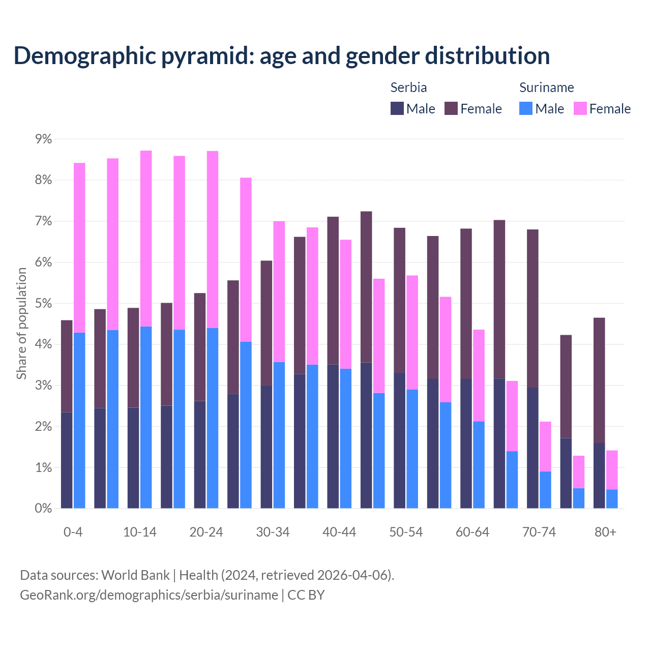 - The share of old-age demographic (65+) in Serbia is 22.7% vs 7.9% in Suriname.