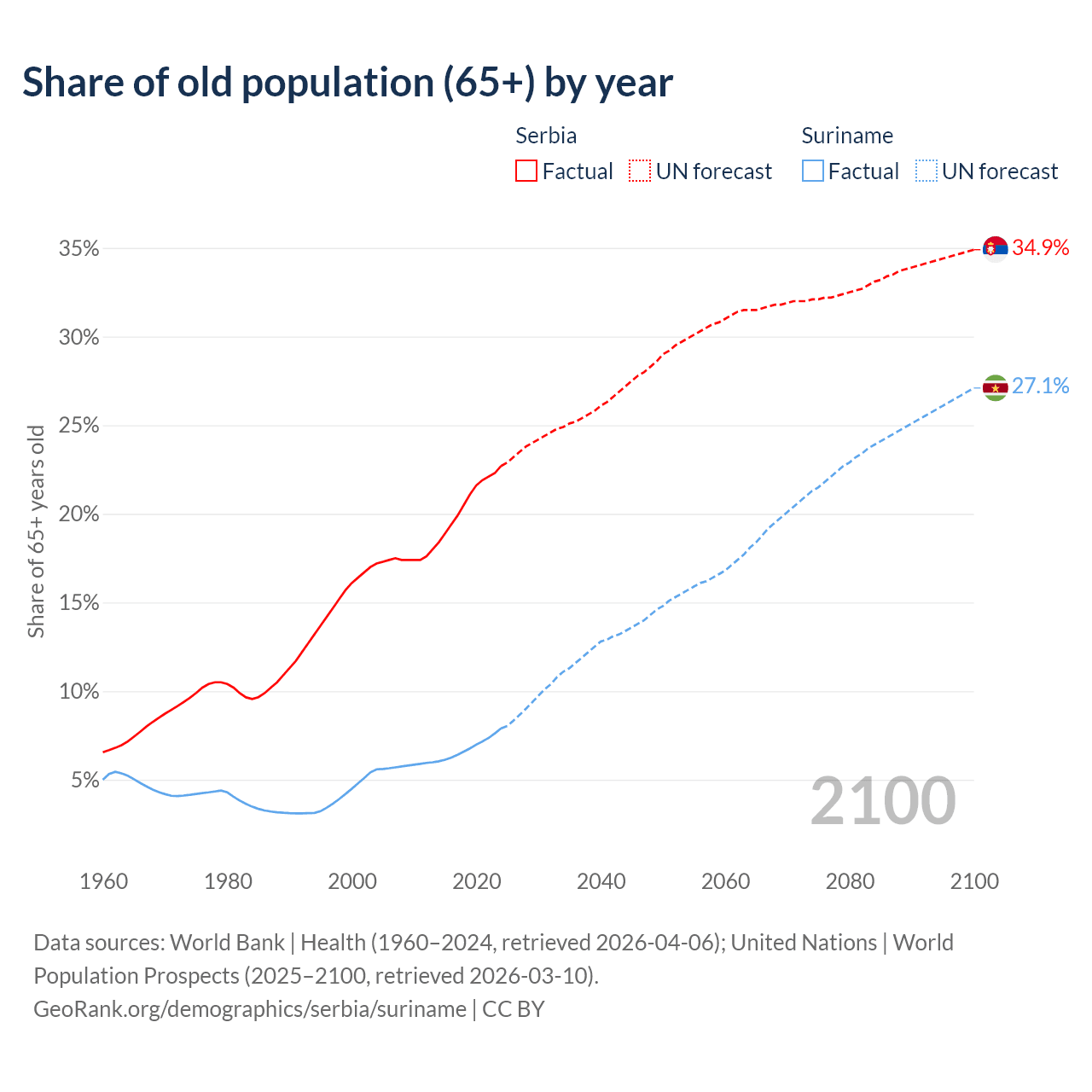 The share of older people aged 65 and over is 22.7% in Serbia and 7.9% in Suriname. Life expectancy in Serbia compared to Suriname .