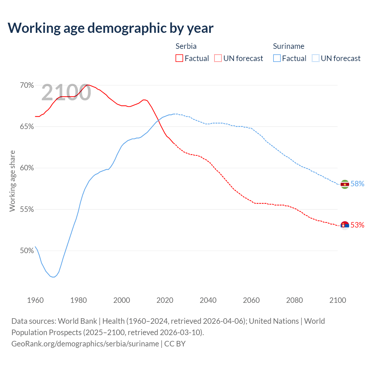 Median age Serbia vs Suriname, 1960-2100