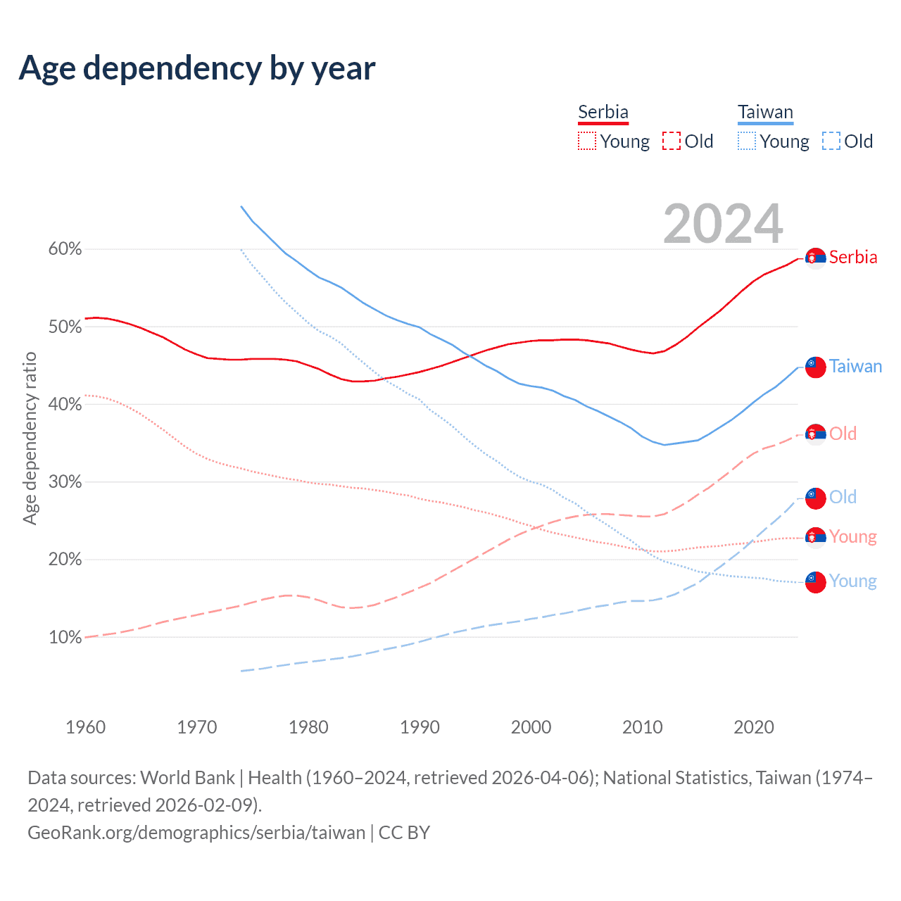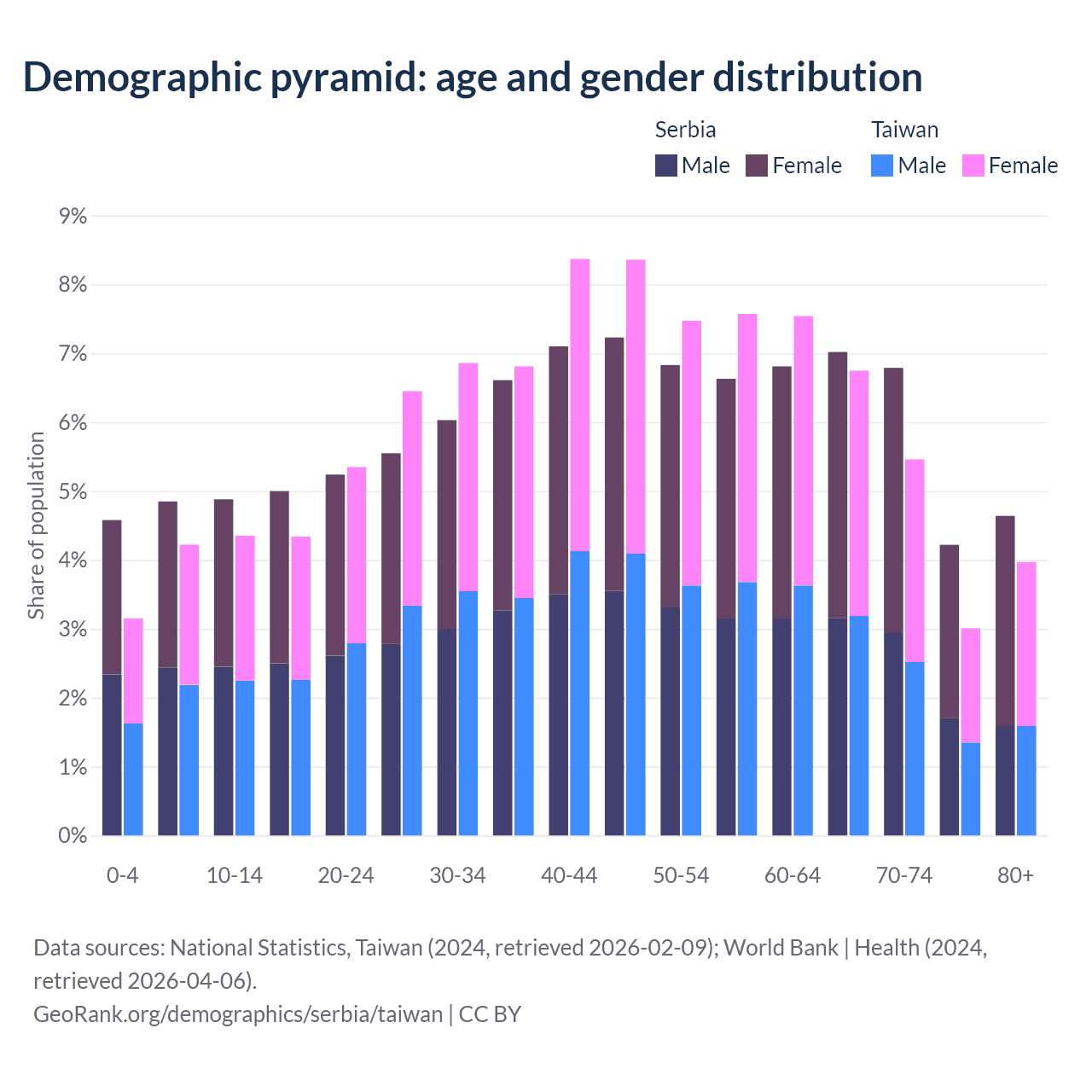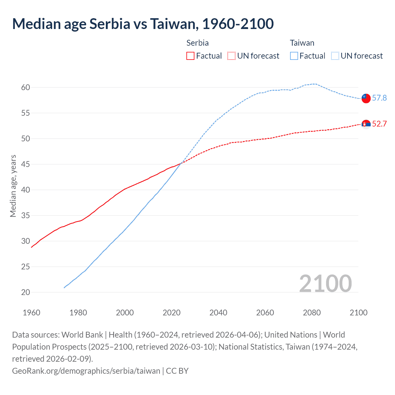 - Serbia is ranked 15/196 by median age (oldest to youngest) vs 16/196 for Taiwan.