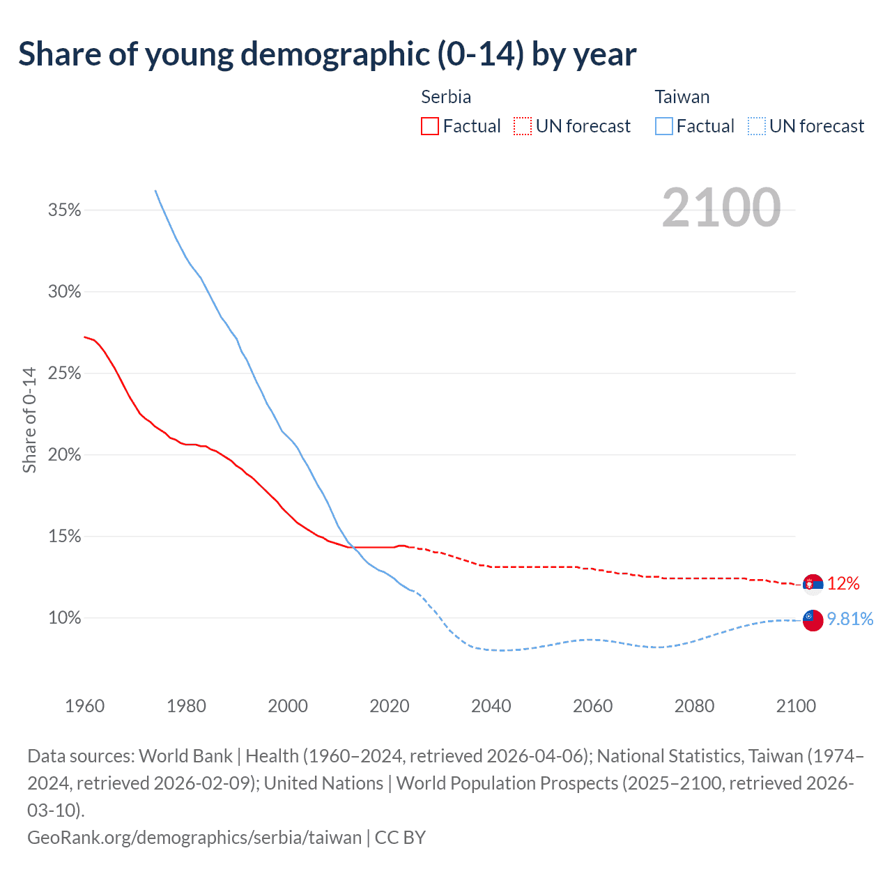 - The share of young demographic (0-15 years old) in Serbia is 14.3% vs 11.7% in Taiwan.