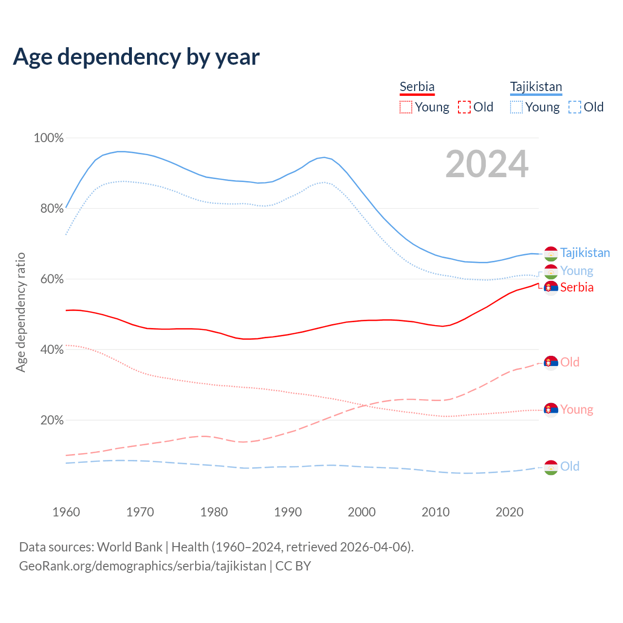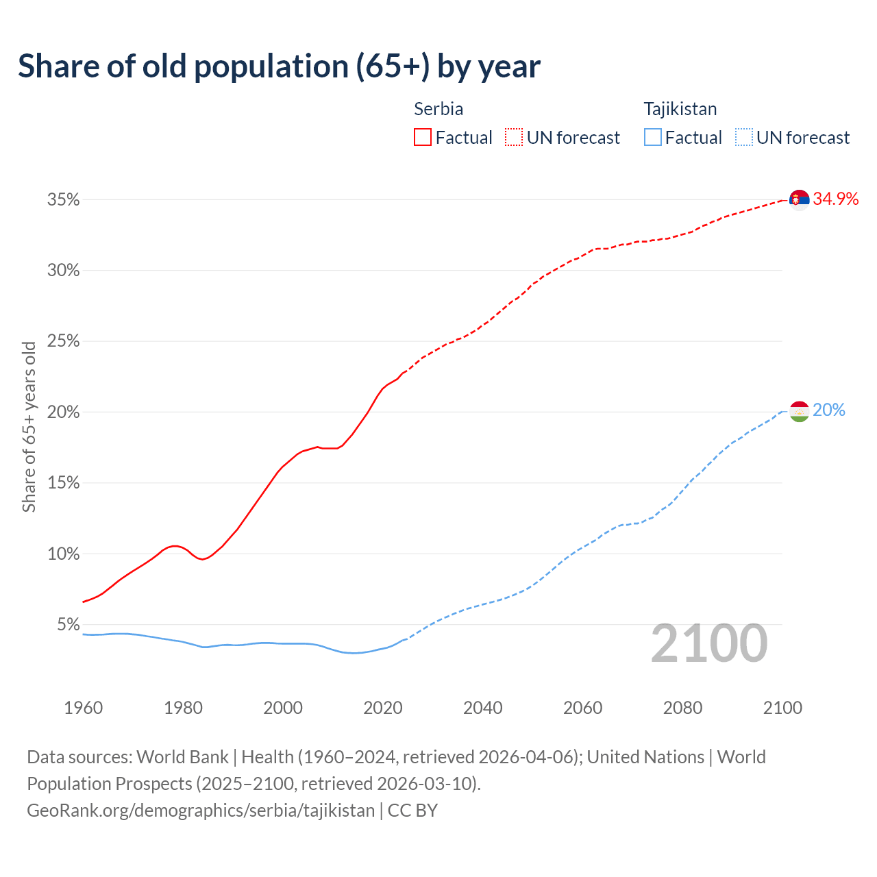 The share of older people aged 65 and over is 22.7% in Serbia and 3.85% in Tajikistan. Life expectancy in Serbia compared to Tajikistan .
