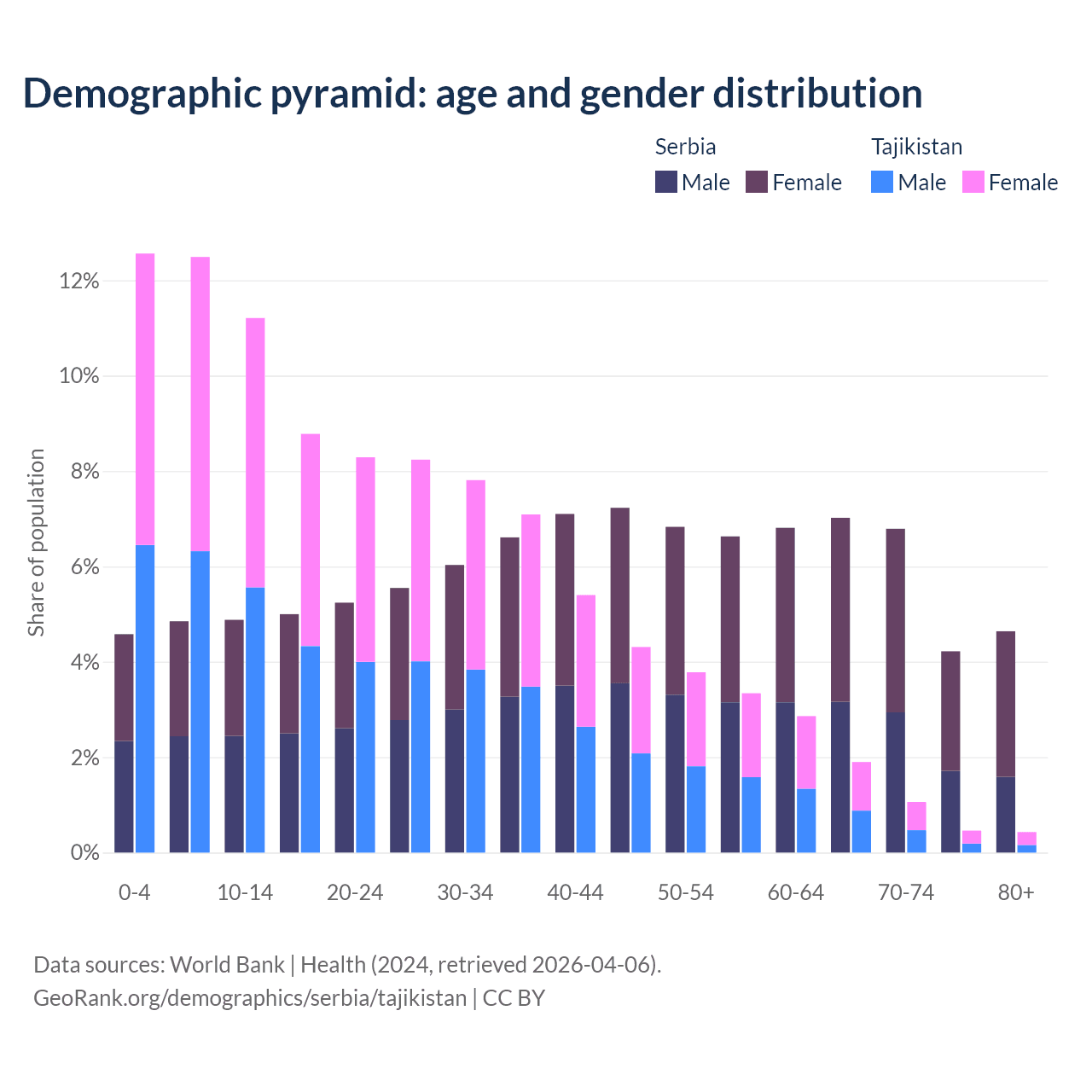 - As of 2026, the population of Serbia is 6.49M vs 11M in Tajikistan - 1.7 times difference.