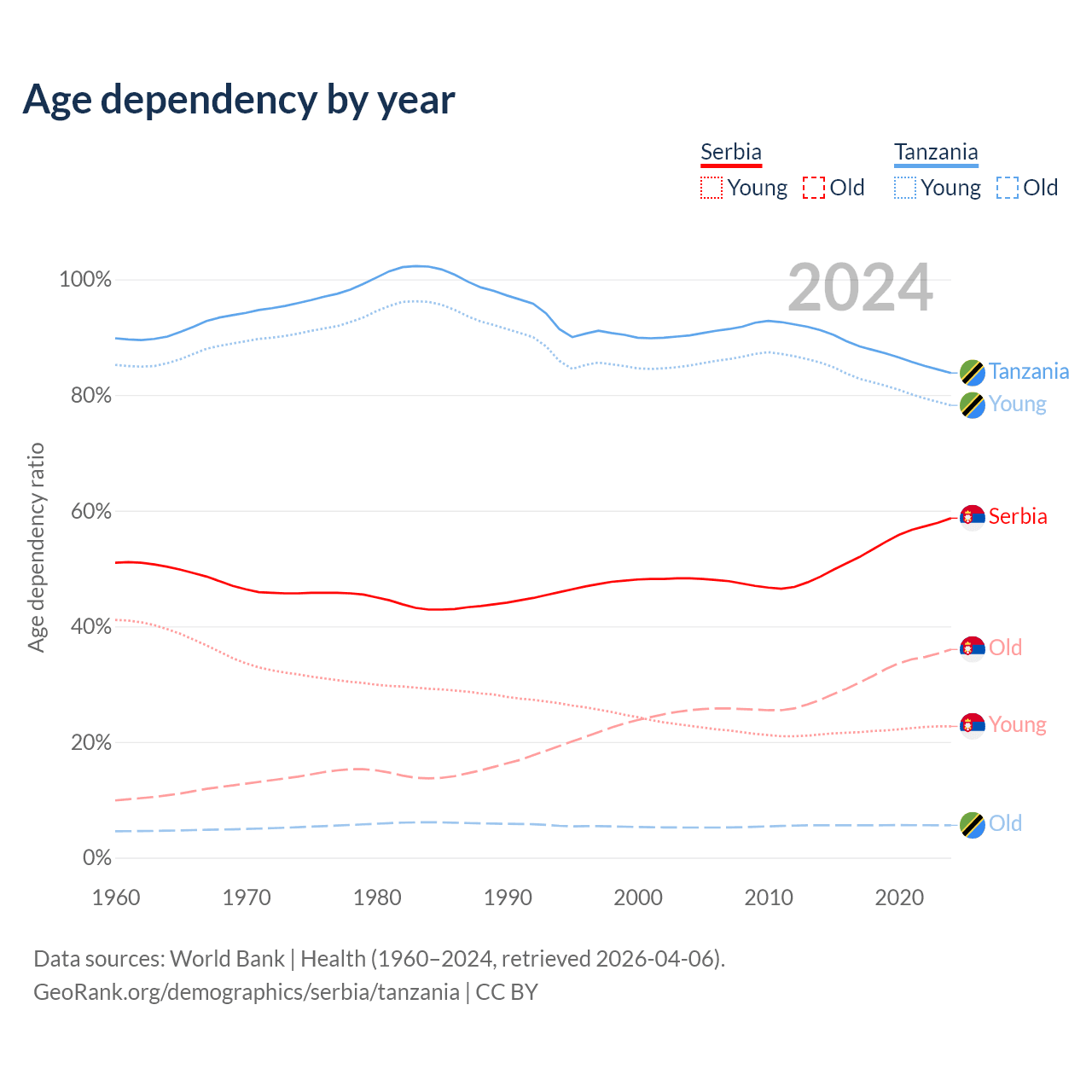 Data sources: World Bank | Health (1960–2024, retrieved 2026-04-06); U.S. Census Bureau (1960–2024, retrieved 2026-02-08).