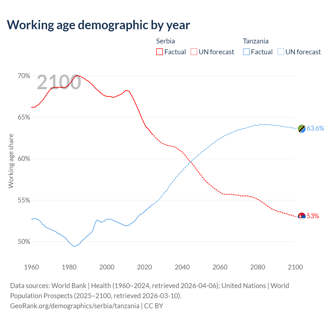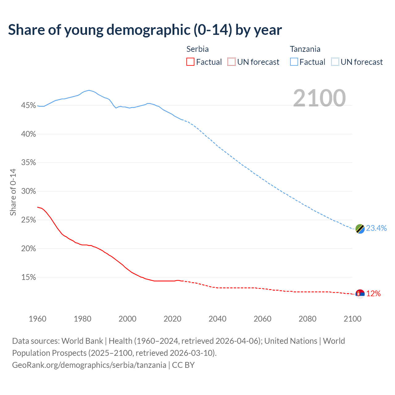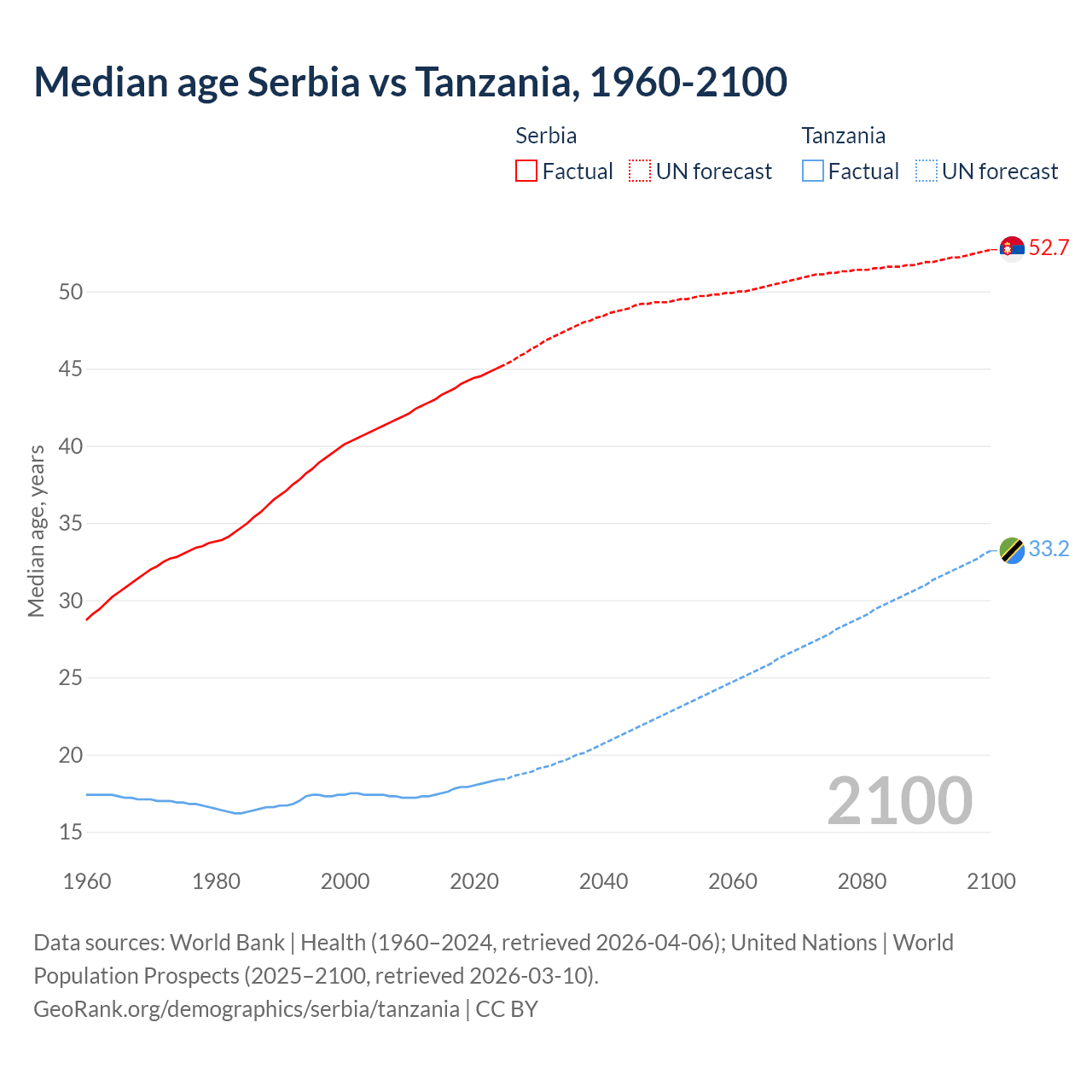 Median age Serbia vs Tanzania, 1960-2100