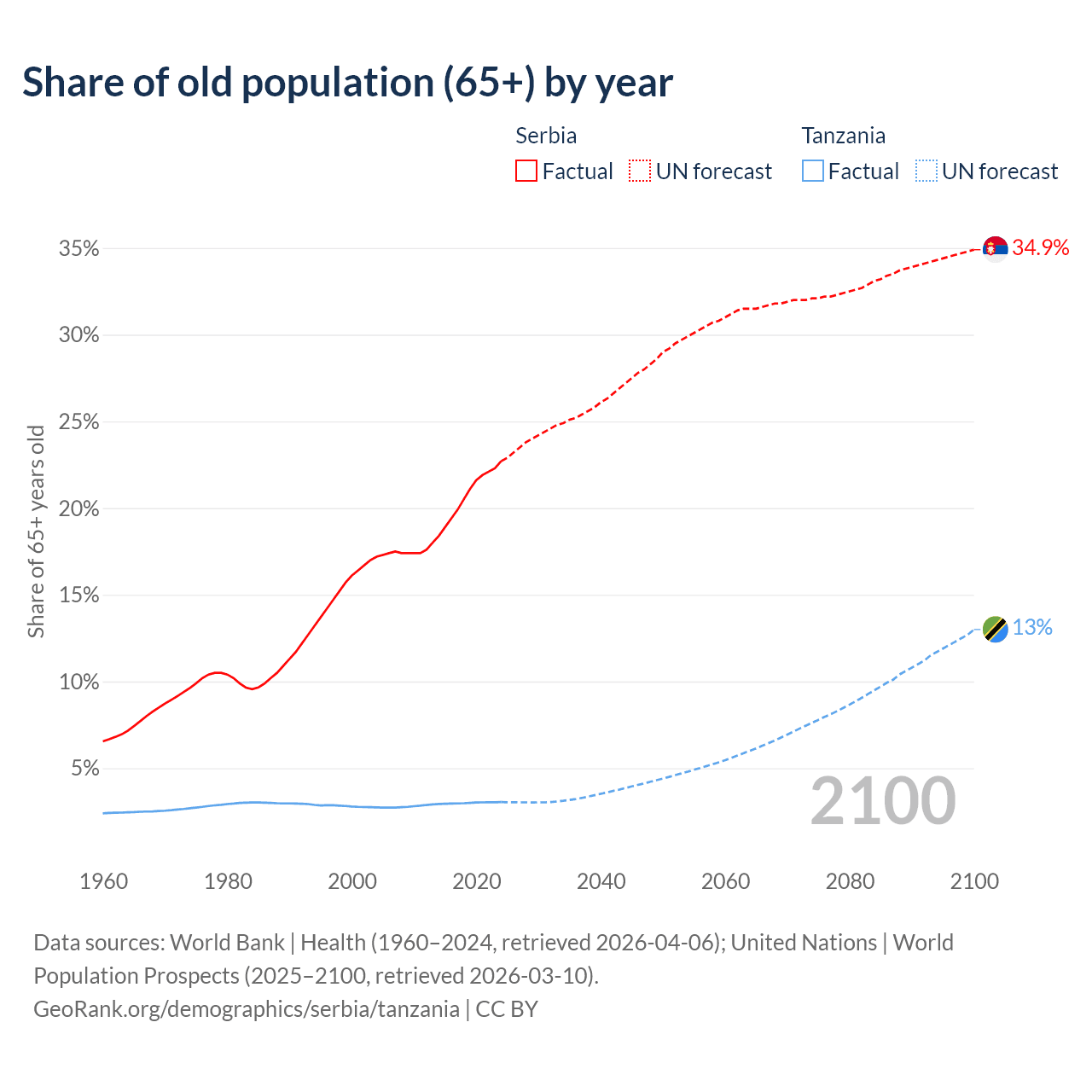 The share of older people aged 65 and over is 22.7% in Serbia and 3.05% in Tanzania. Life expectancy in Serbia compared to Tanzania .