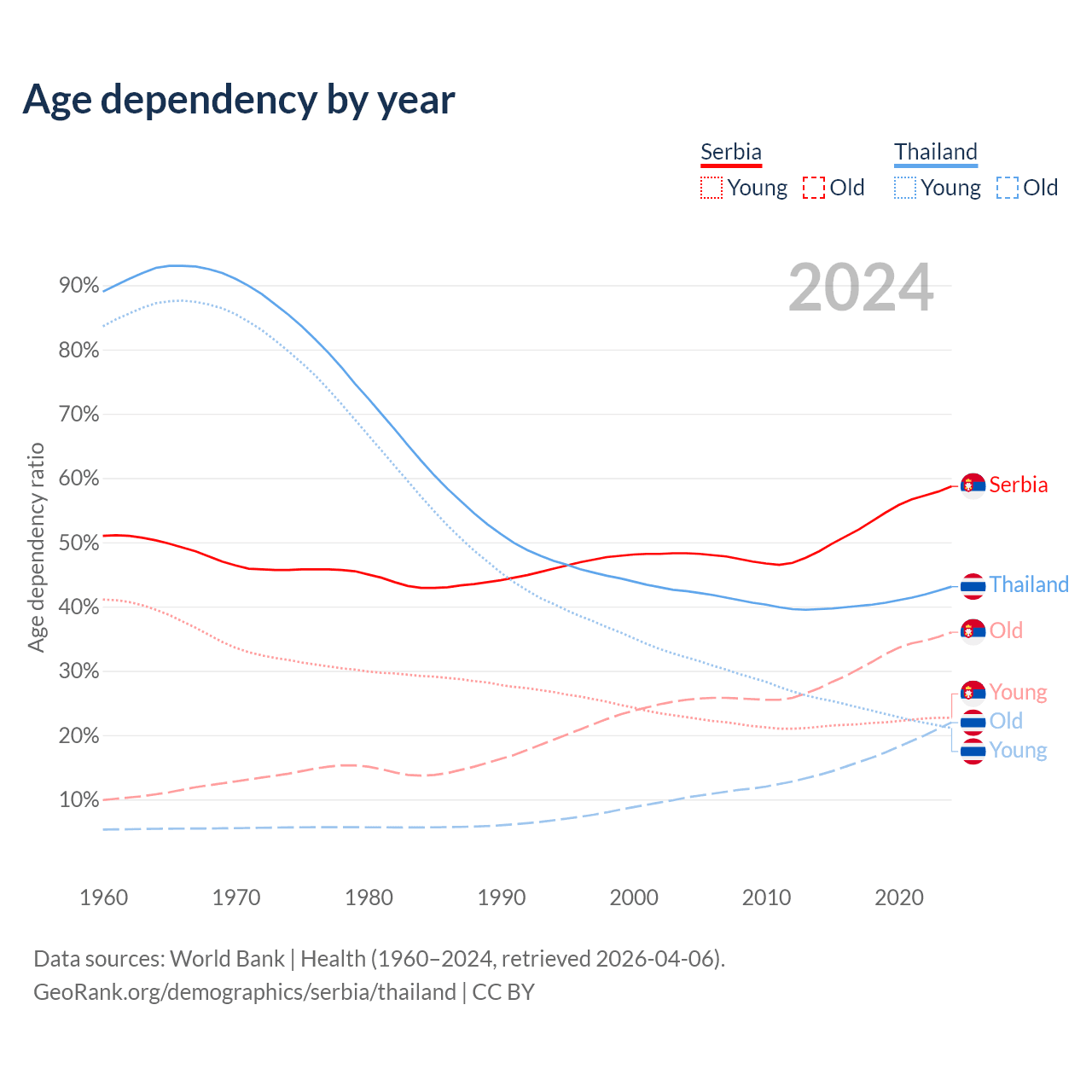 - Serbia is ranked 15/196 by median age (oldest to youngest) vs 40/196 for Thailand.