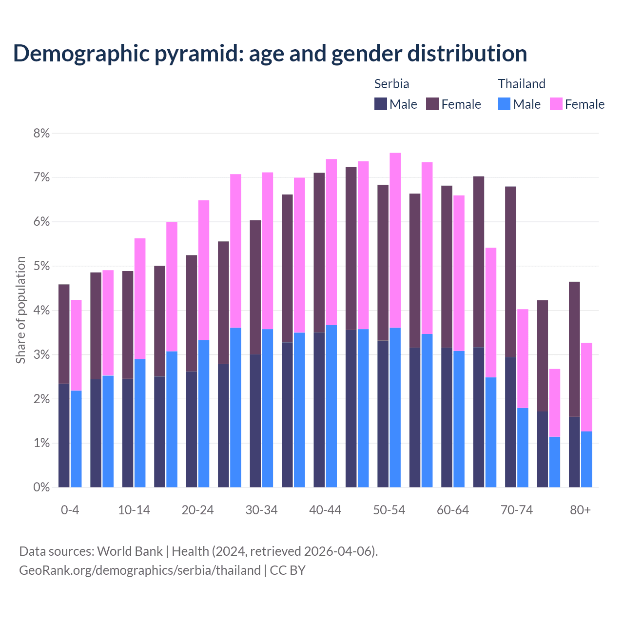 - As of 2026, the population of Serbia is 6.49M vs 71.6M in Thailand - 11 times difference.