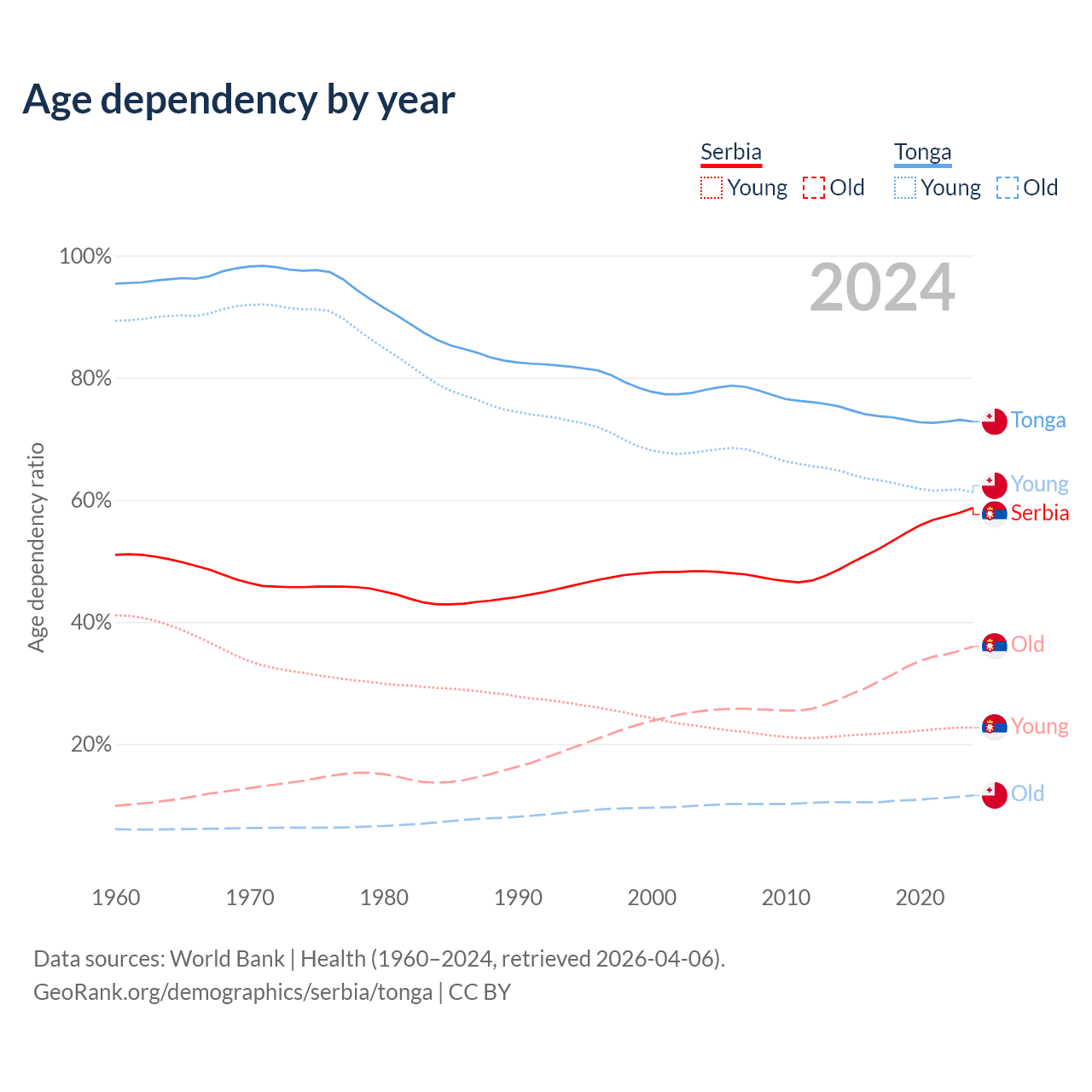 Median age Serbia vs Tonga, 1960-2100