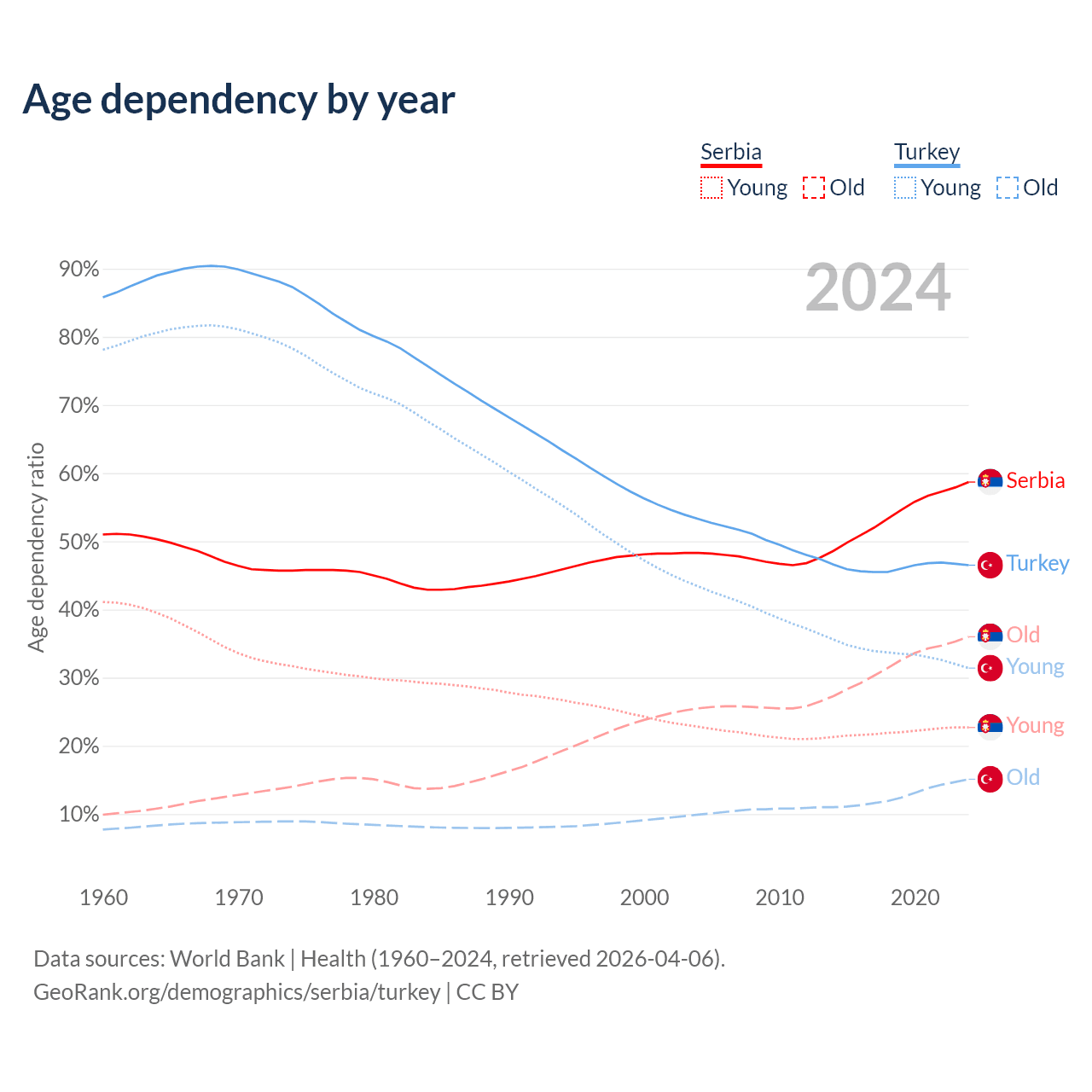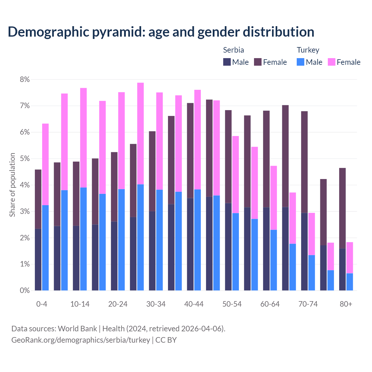 - Serbia is ranked 15/196 by median age (oldest to youngest) vs 83/196 for Turkey.
