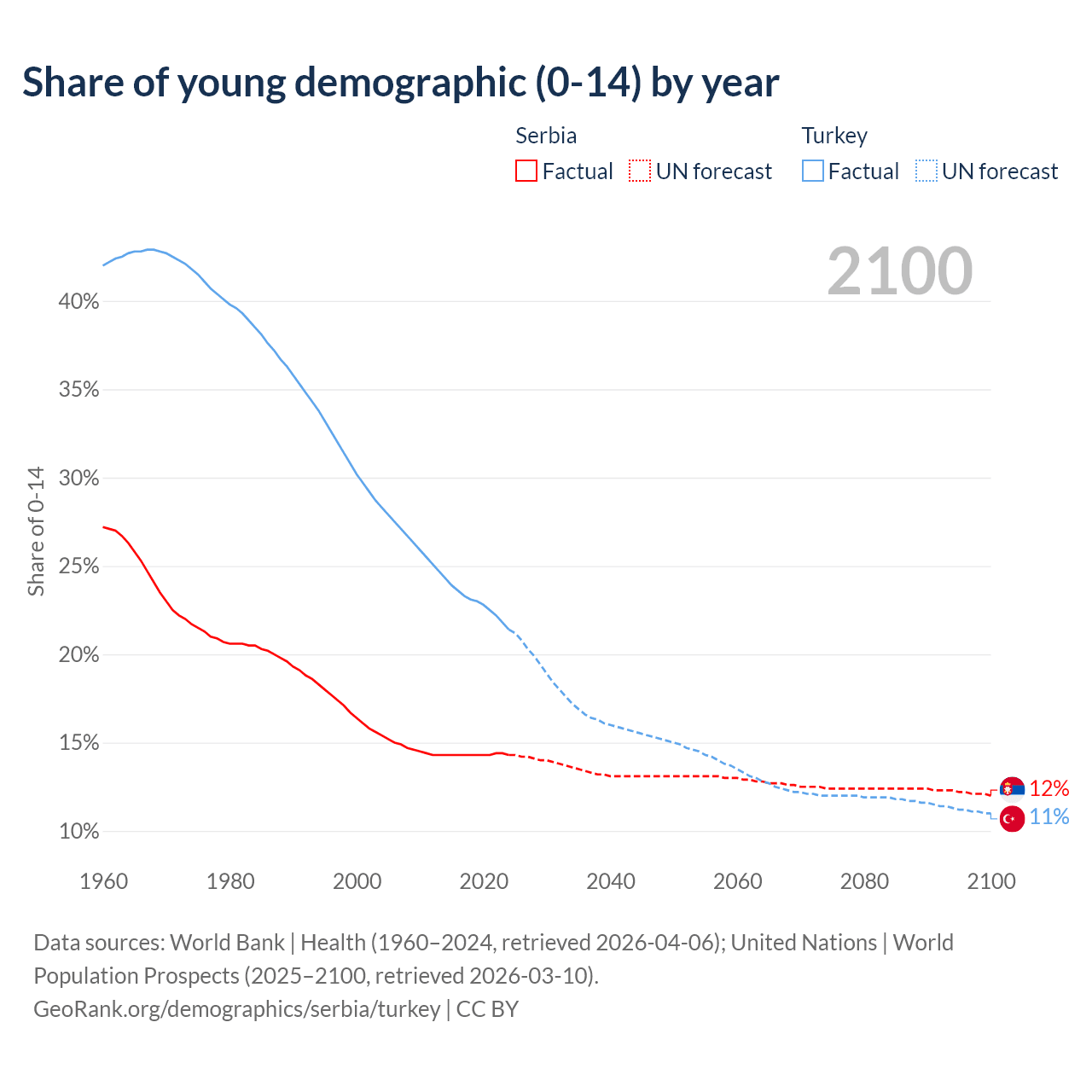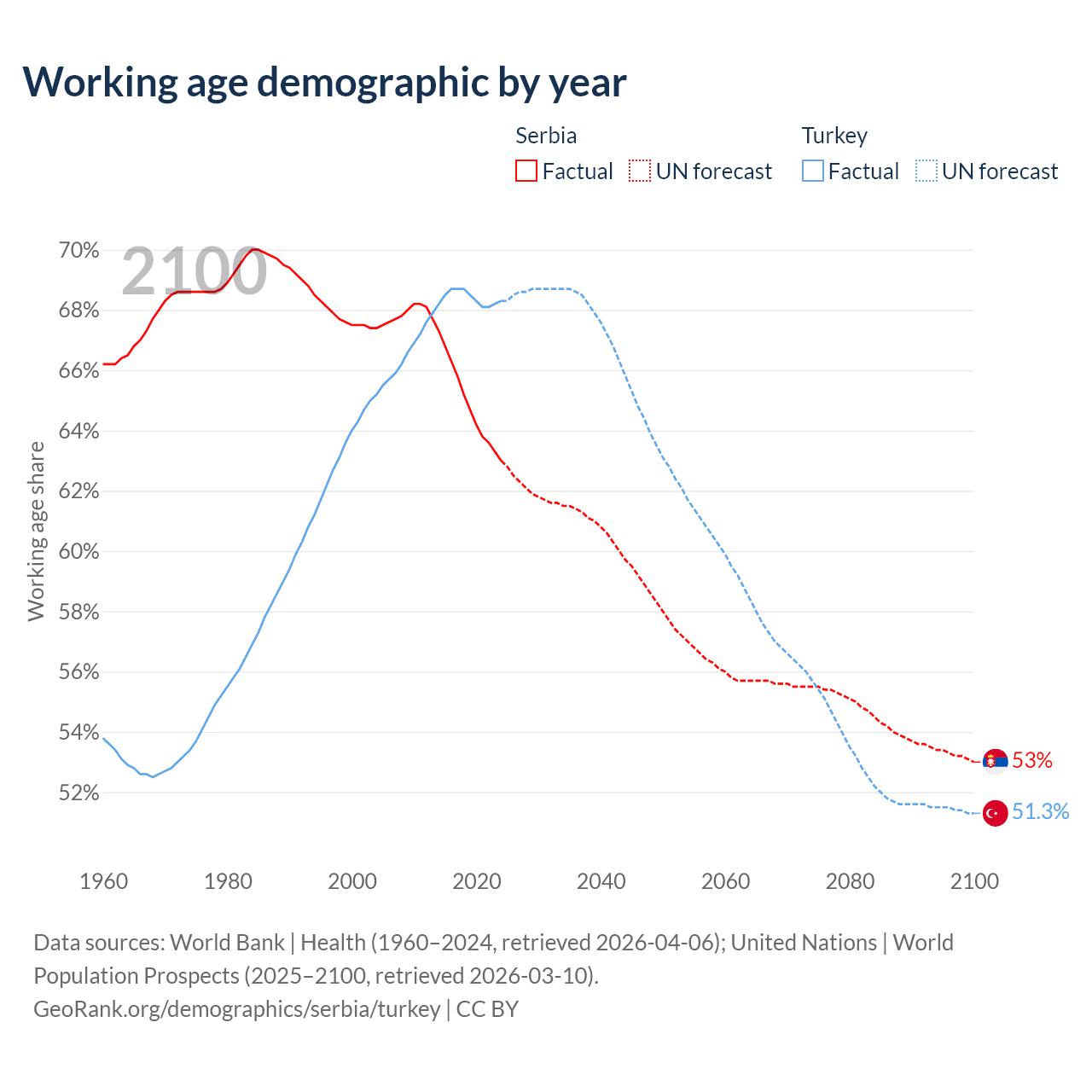Median age Serbia vs Turkey, 1960-2100