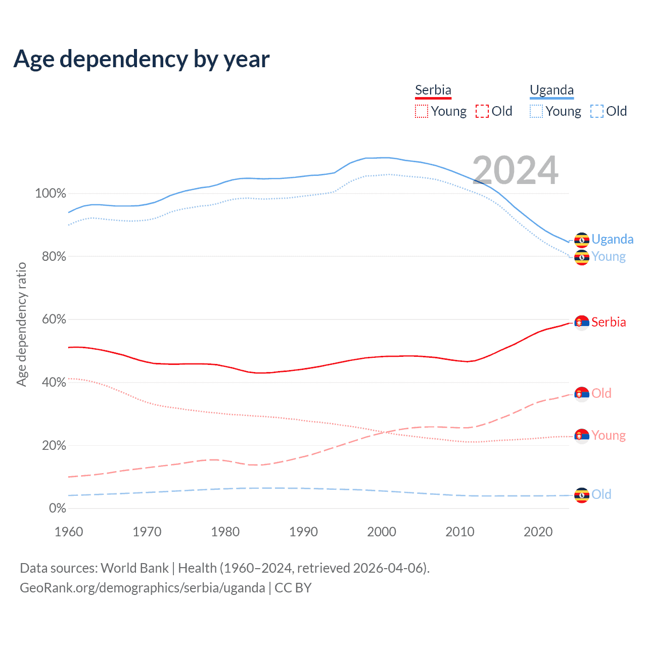 - The share of old-age demographic (65+) in Serbia is 22.7% vs 2.19% in Uganda.