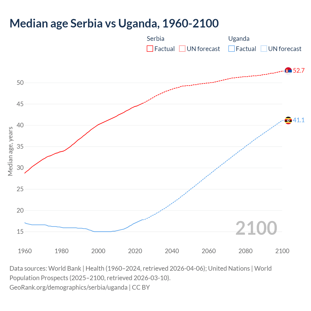 - The median age in Serbia is 45.1 years compared to 17.8 years in Uganda.