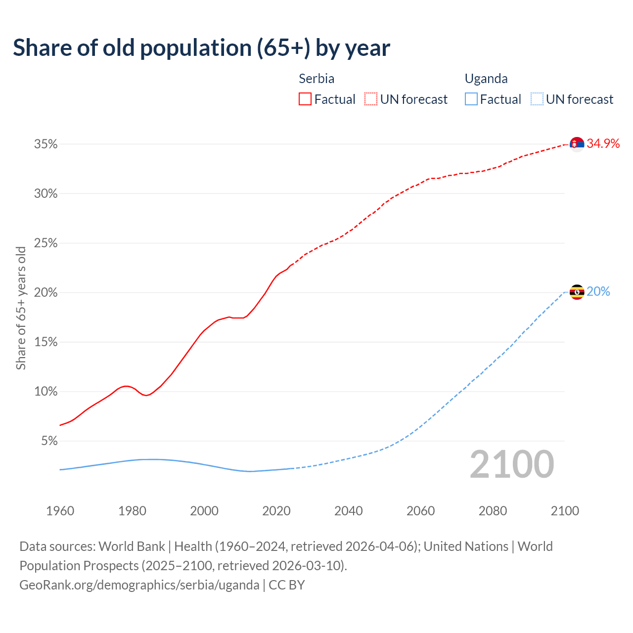The share of older people aged 65 and over is 22.7% in Serbia and 2.19% in Uganda. Life expectancy in Serbia compared to Uganda .