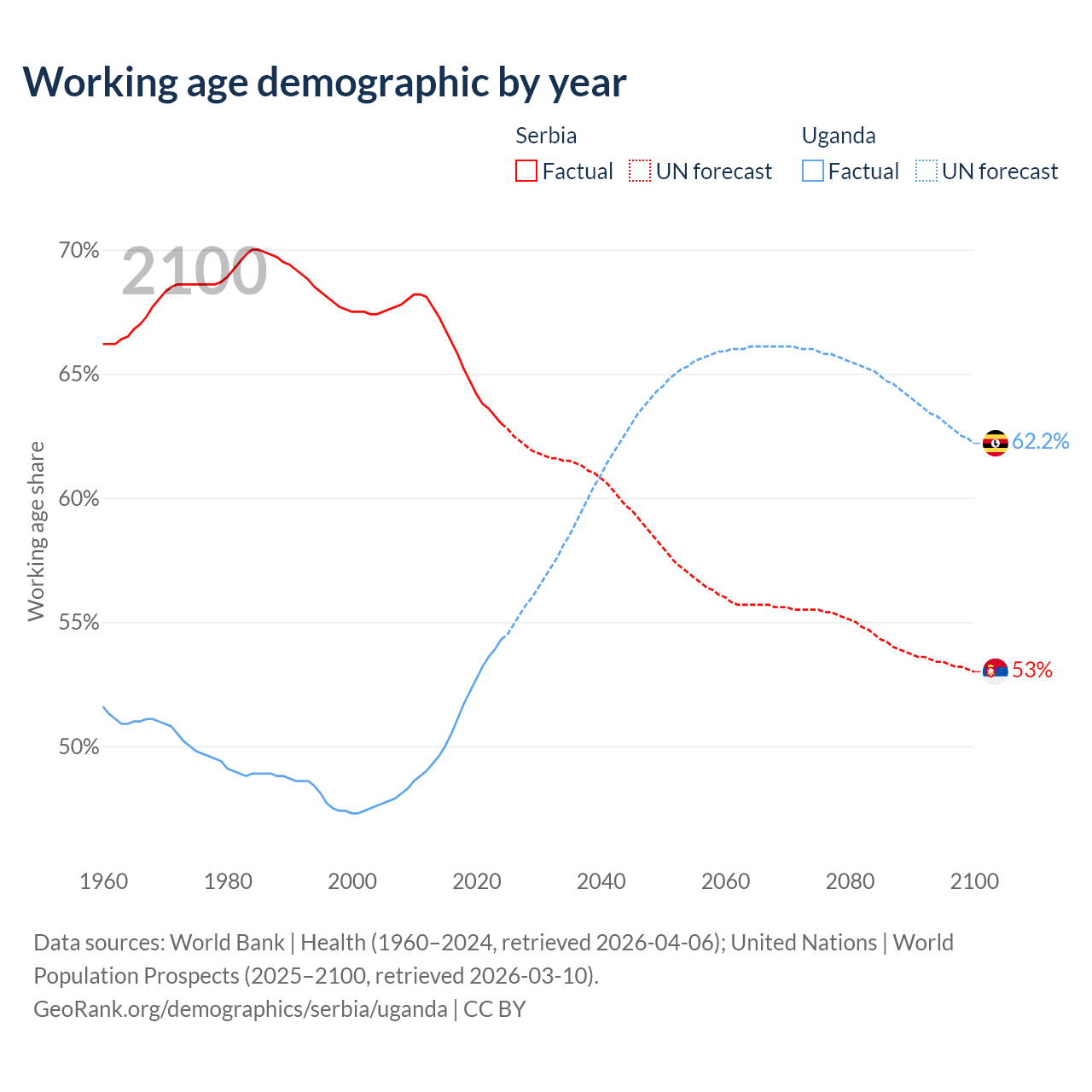 - Serbia has 4.09M working age adults (aged 15-64) vs 28.9M in Uganda.