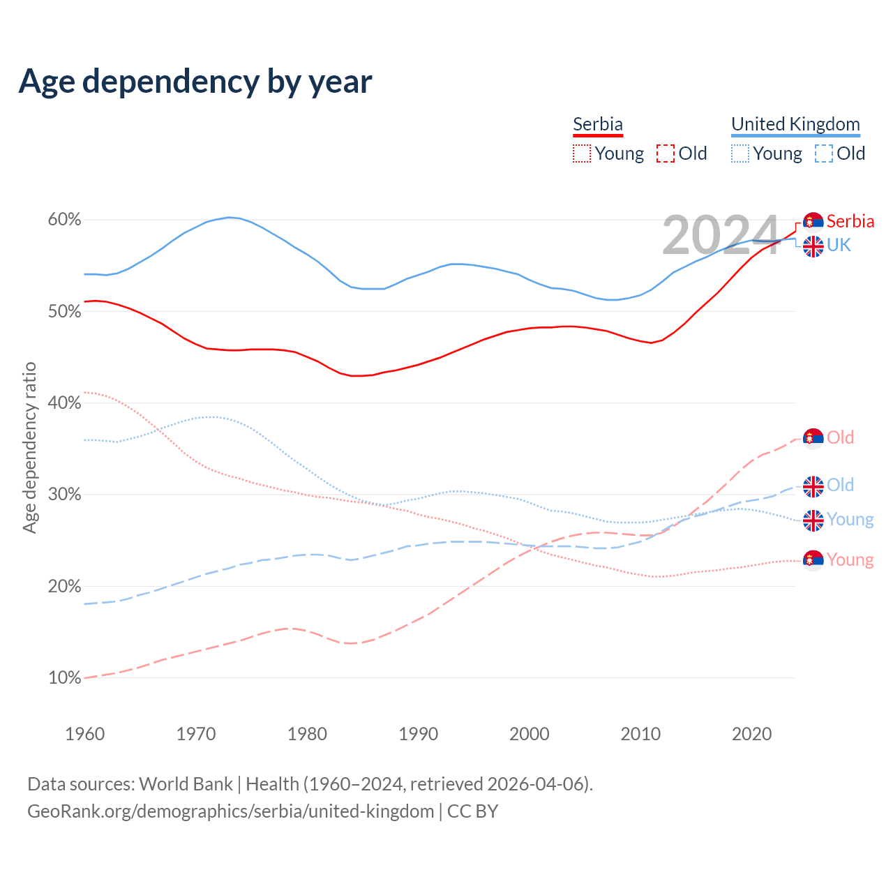 Data sources: World Bank | Health (1960–2024, retrieved 2026-04-06); U.S. Census Bureau (1960–2024, retrieved 2026-02-08).