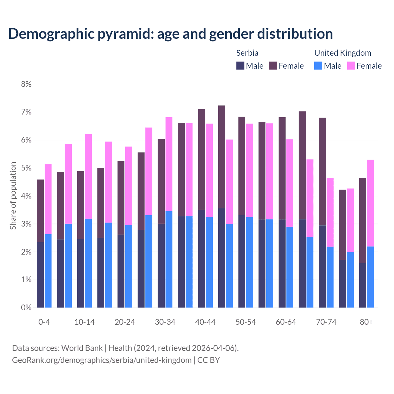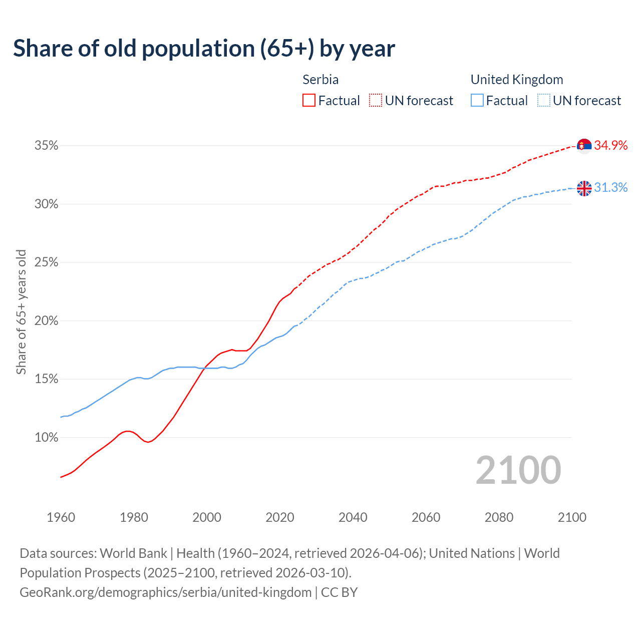 The share of older people aged 65 and over is 22.7% in Serbia and 19.5% in the United Kingdom. Life expectancy in Serbia compared to the United Kingdom .