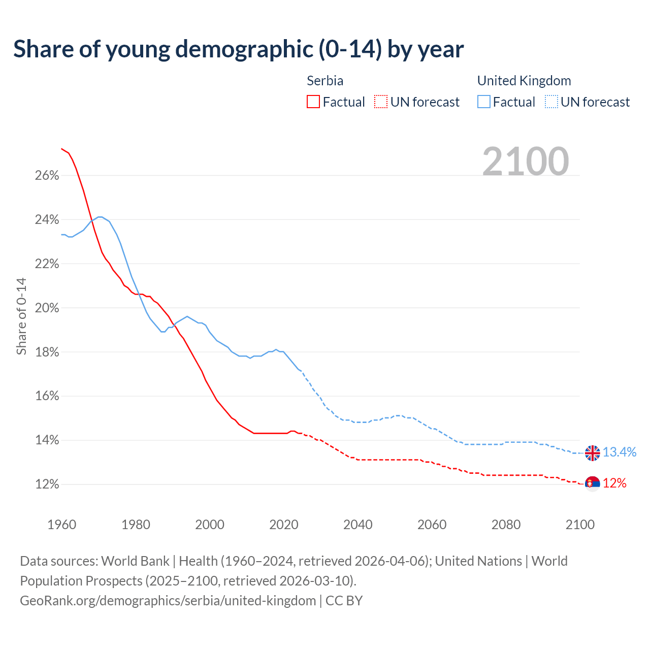Median age Serbia vs United Kingdom, 1960-2100