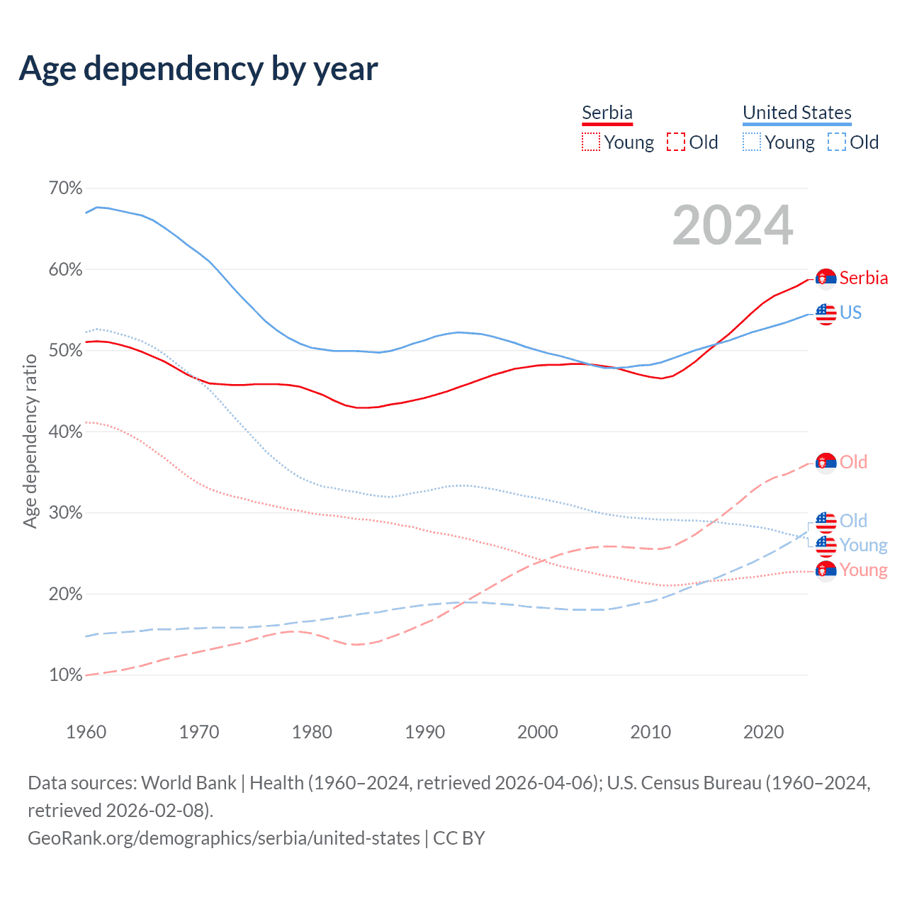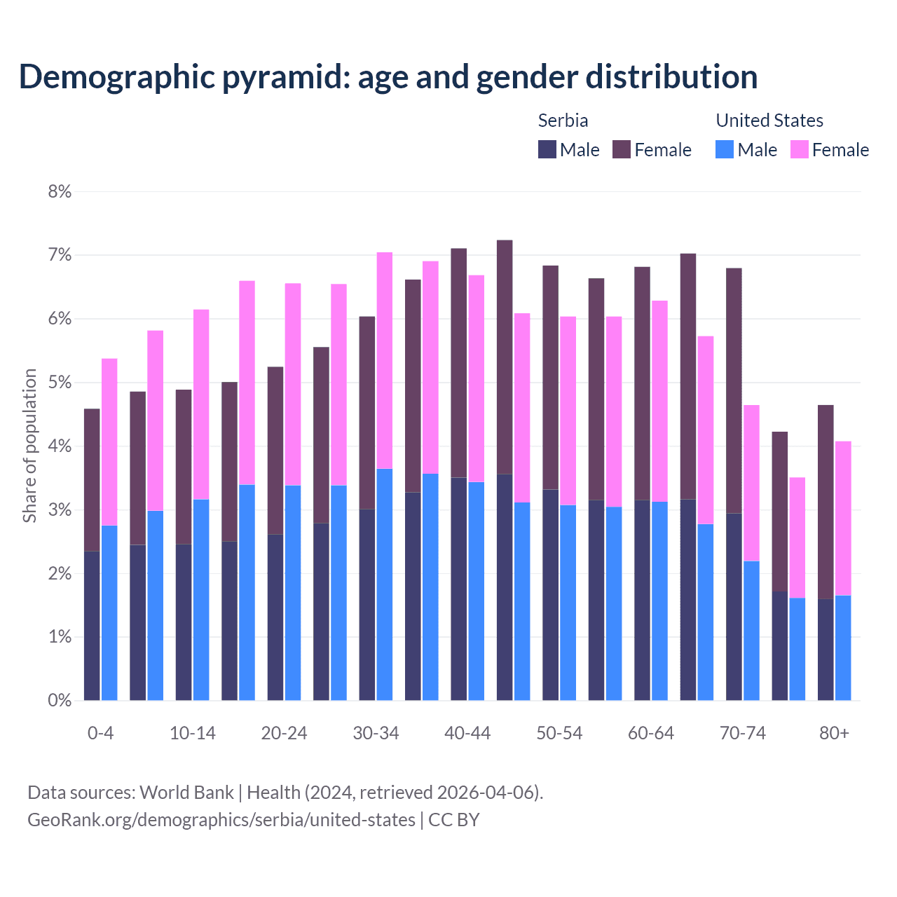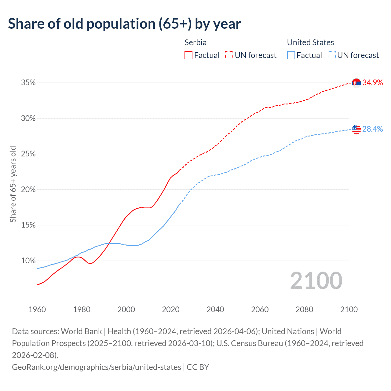 The share of older people aged 65 and over is 22.7% in Serbia and 17.9% in the United States. Life expectancy in Serbia compared to the United States .