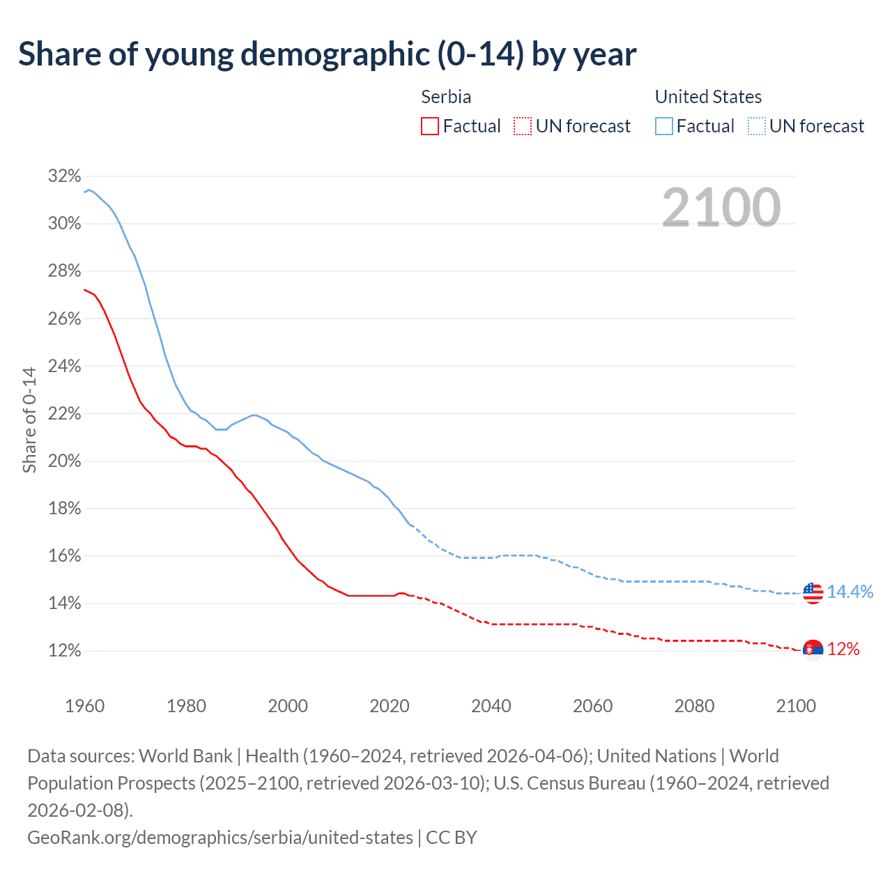 - The share of young demographic (0-15 years old) in Serbia is 14.3% vs 17.3% in the United States.