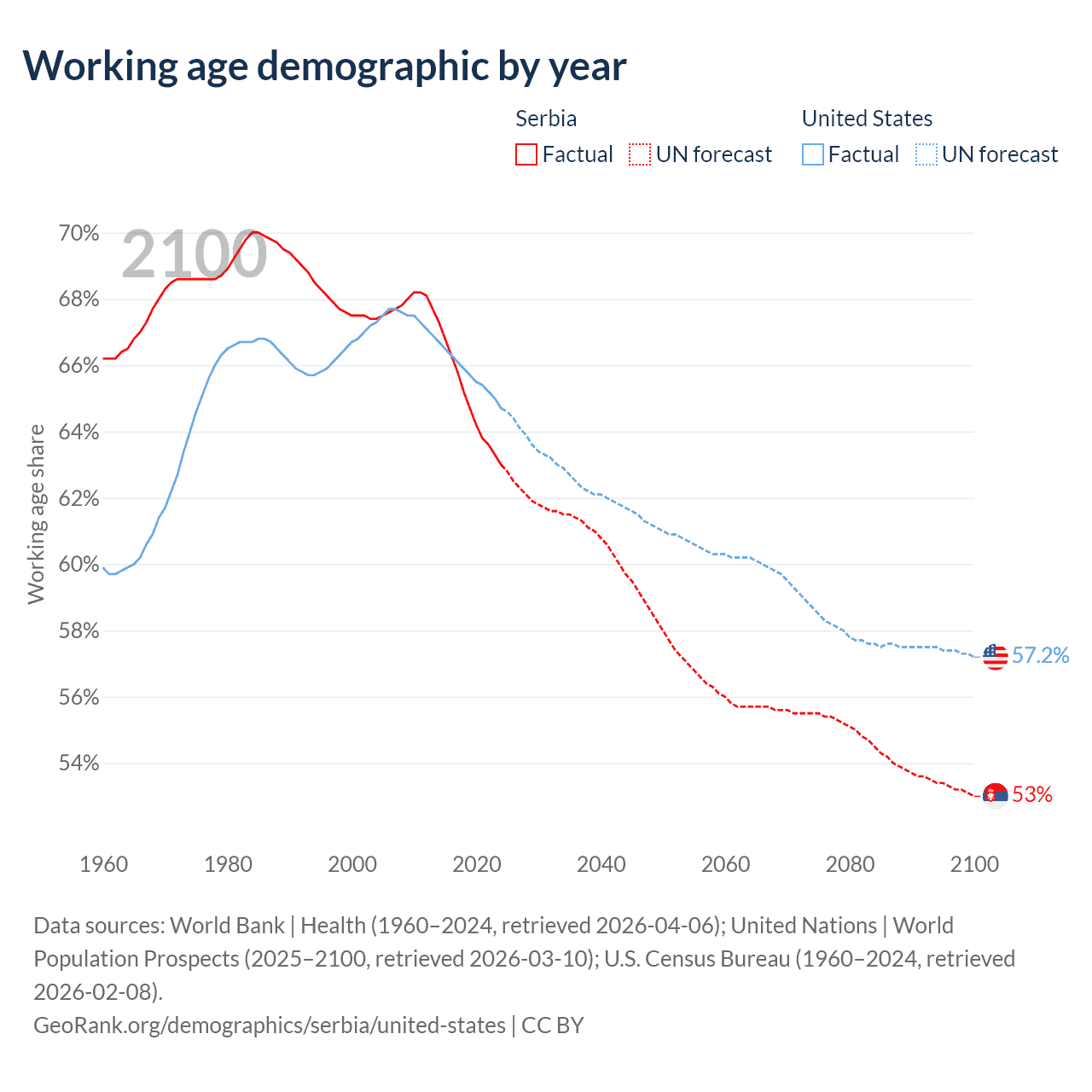 Median age Serbia vs United States, 1960-2100