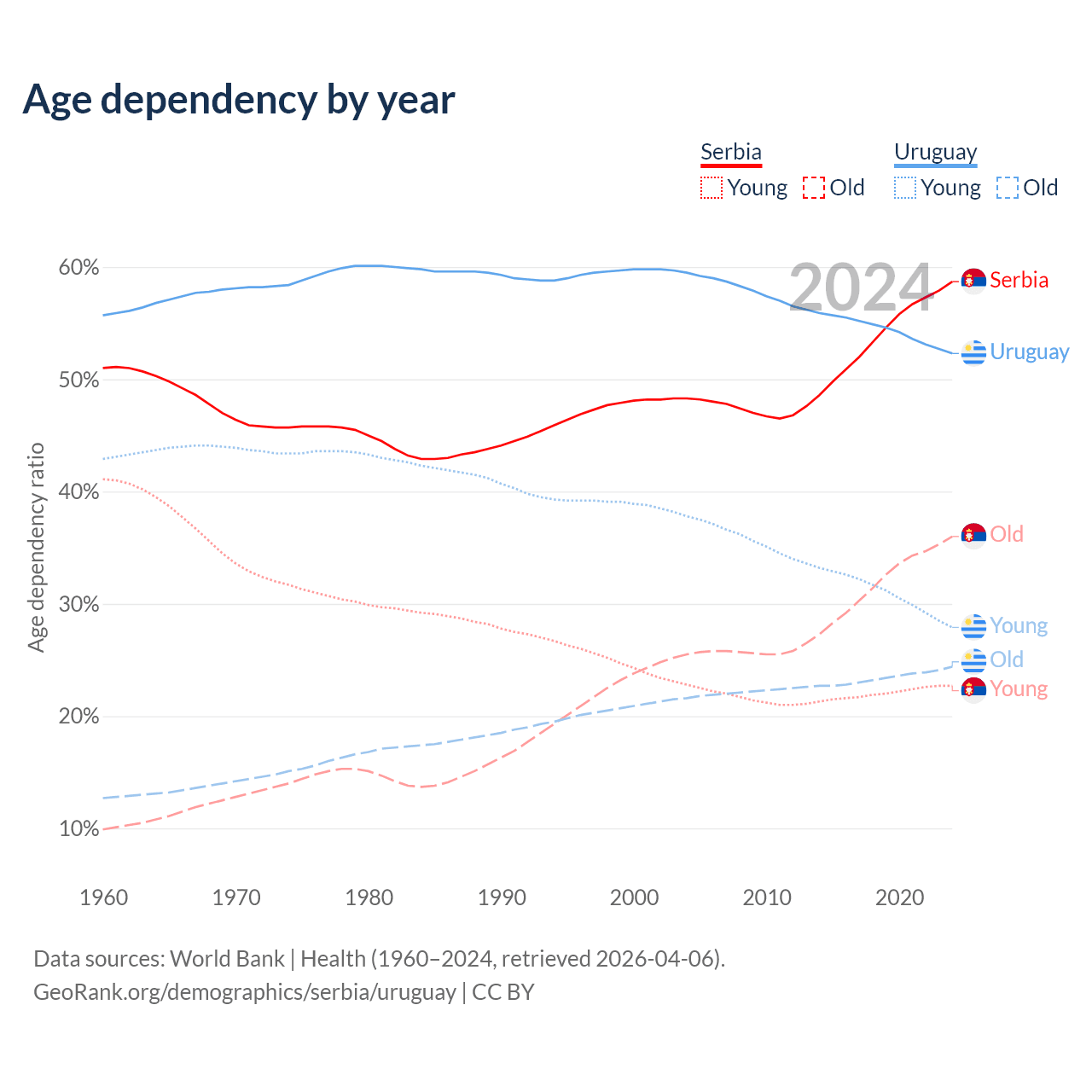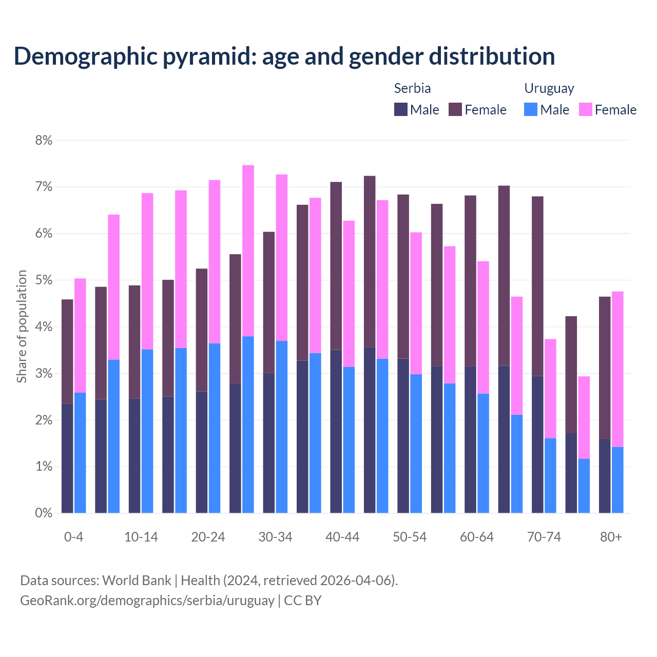 - Serbia is ranked 15/196 by median age (oldest to youngest) vs 63/196 for Uruguay.