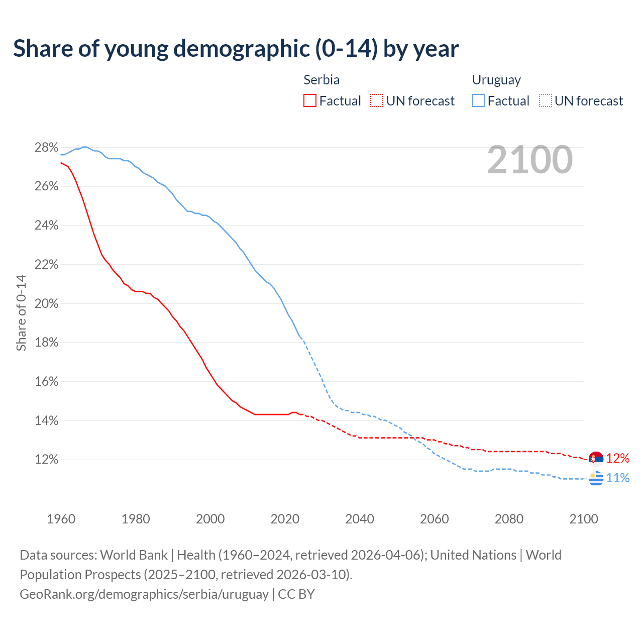 - The share of young demographic (0-15 years old) in Serbia is 14.3% vs 18.3% in Uruguay.