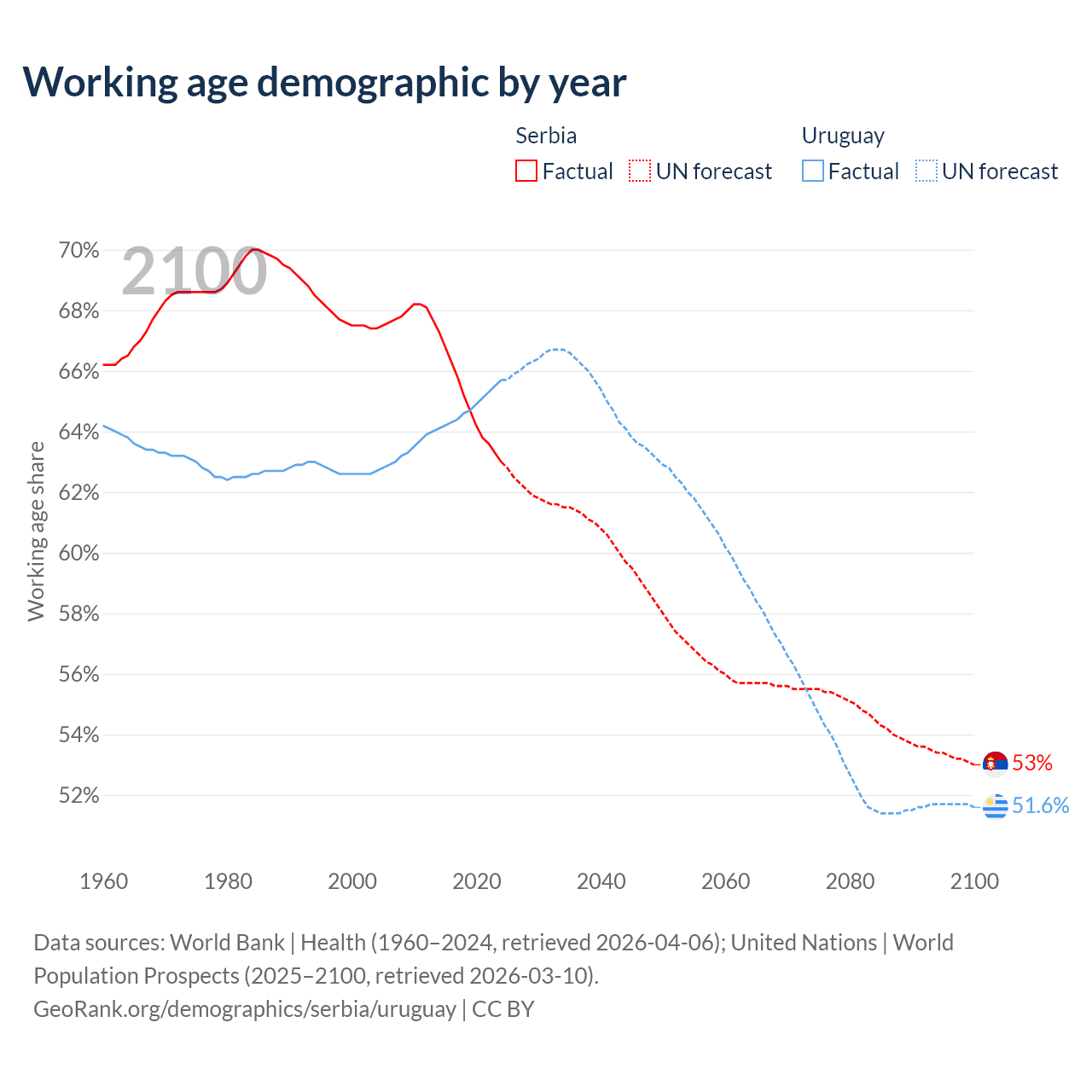 - Serbia has 4.09M working age adults (aged 15-64) vs 2.22M in Uruguay.