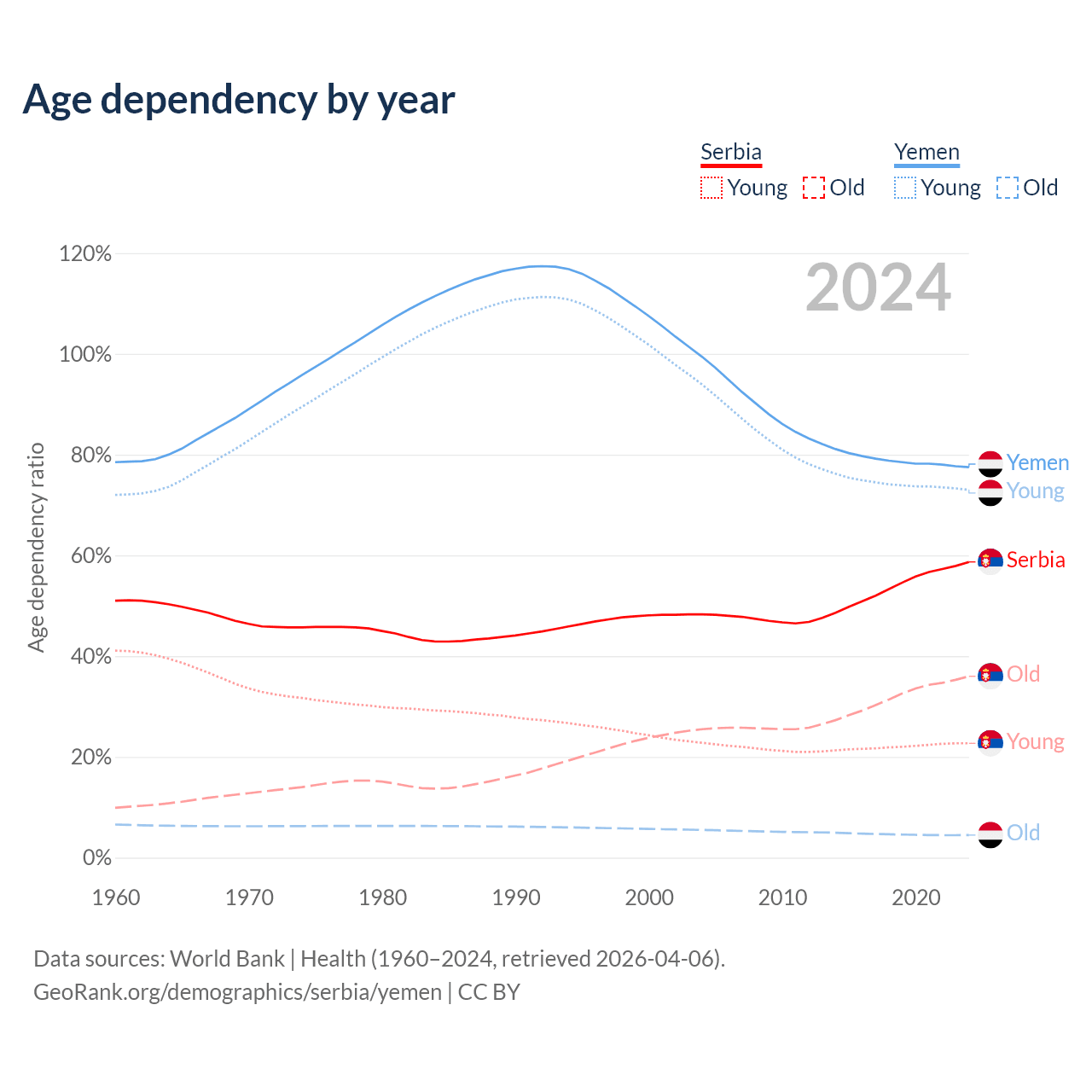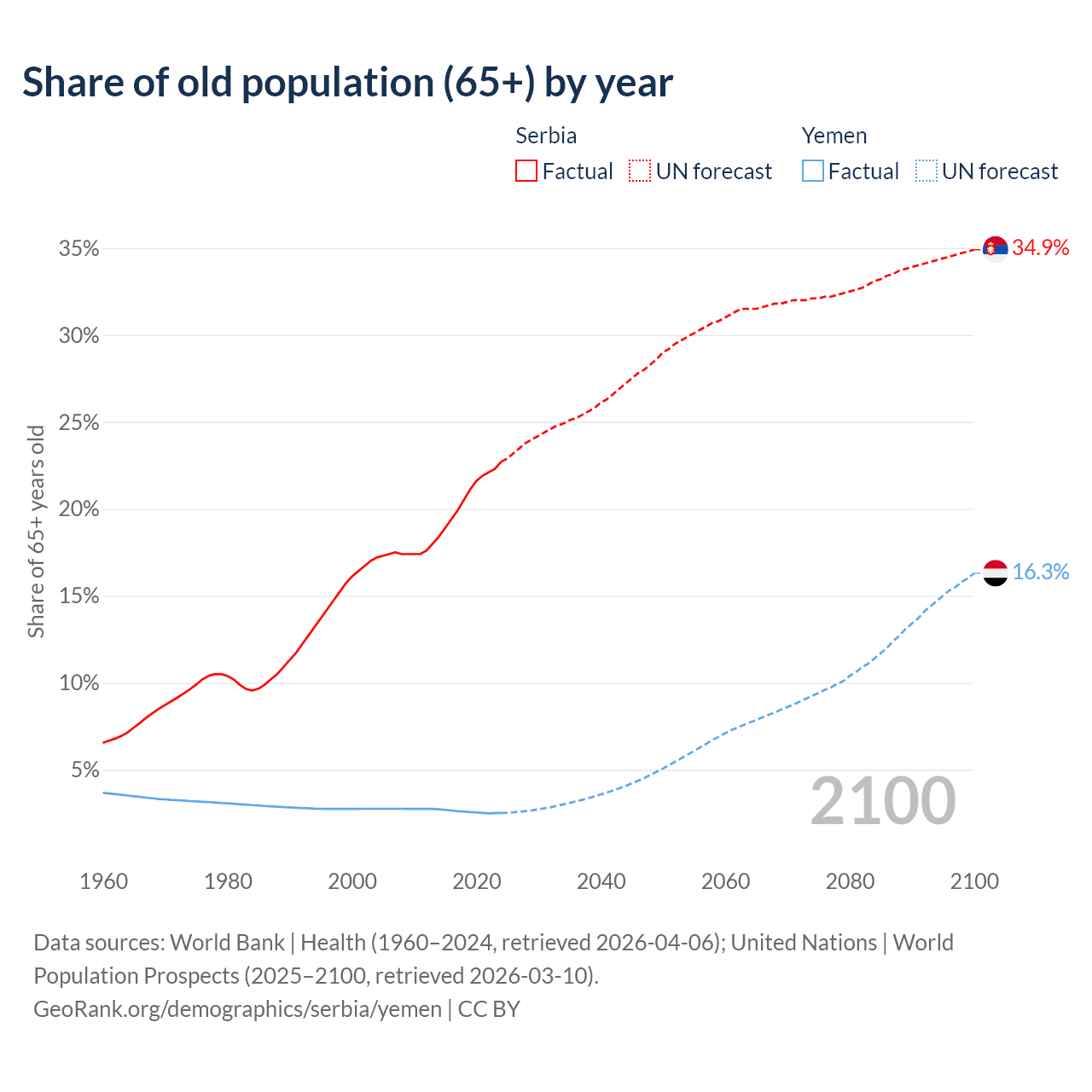 The share of older people aged 65 and over is 22.7% in Serbia and 2.52% in Yemen. Life expectancy in Serbia compared to Yemen .