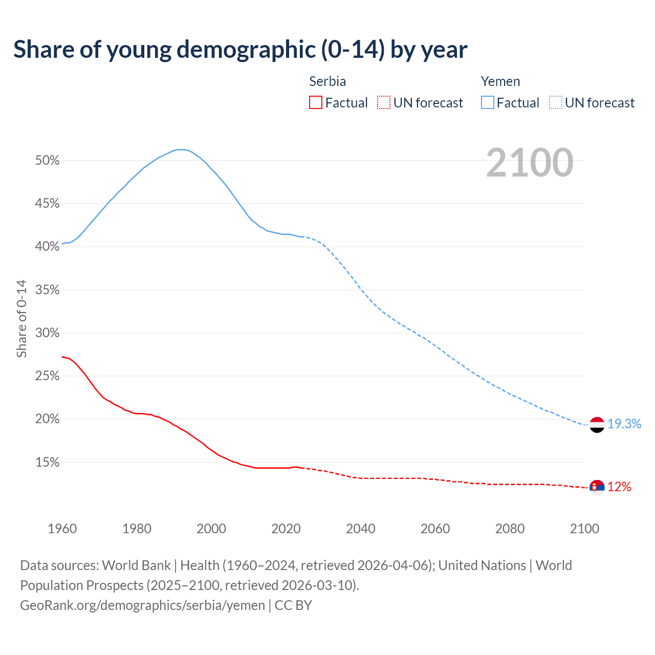 - The share of young demographic (0-15 years old) in Serbia is 14.3% vs 41.1% in Yemen.