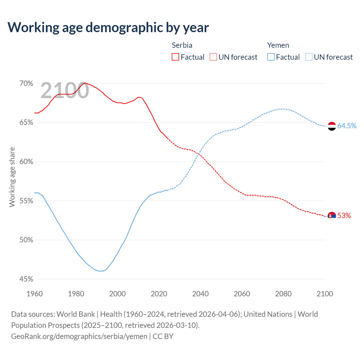 - Serbia has 4.09M working age adults (aged 15-64) vs 24.4M in Yemen.