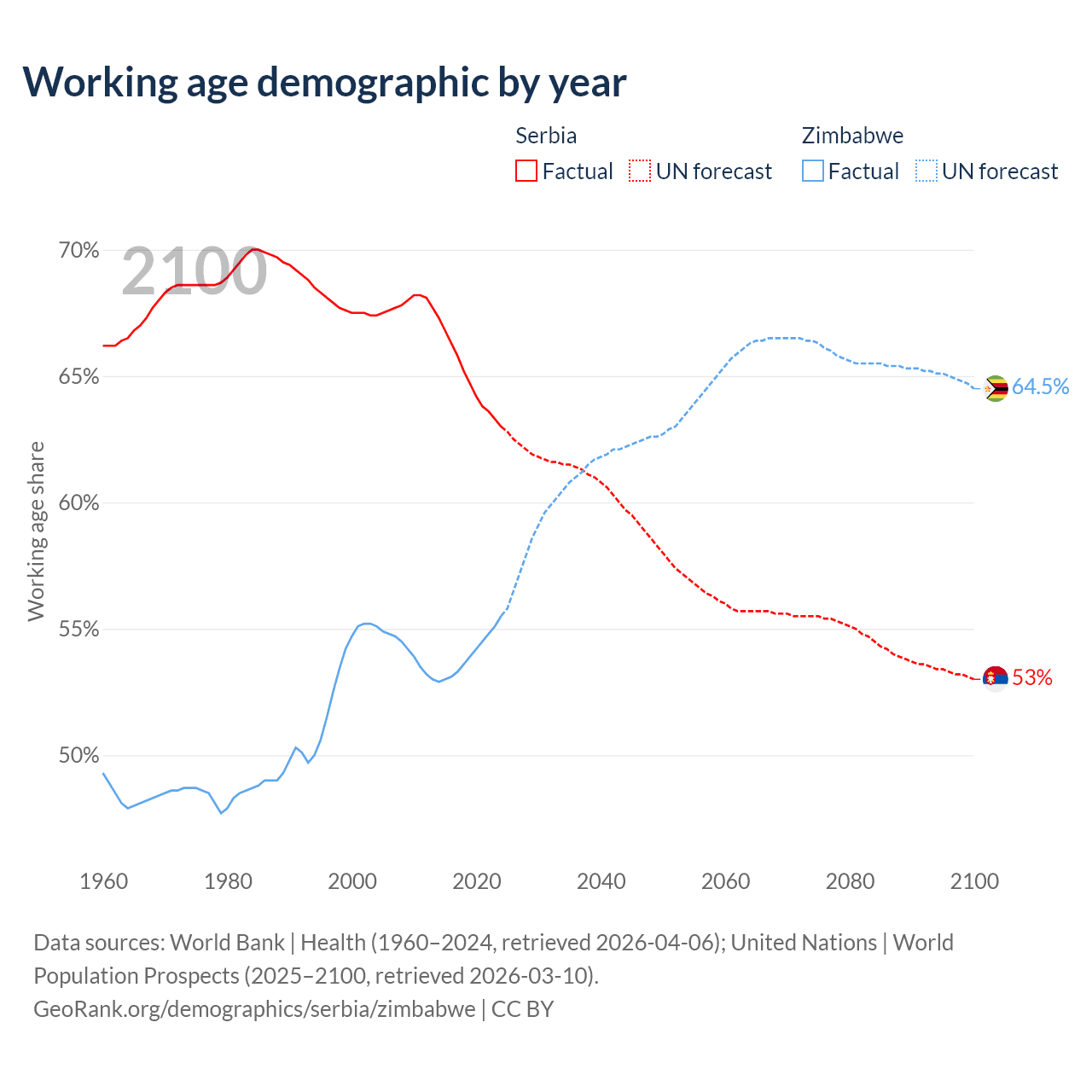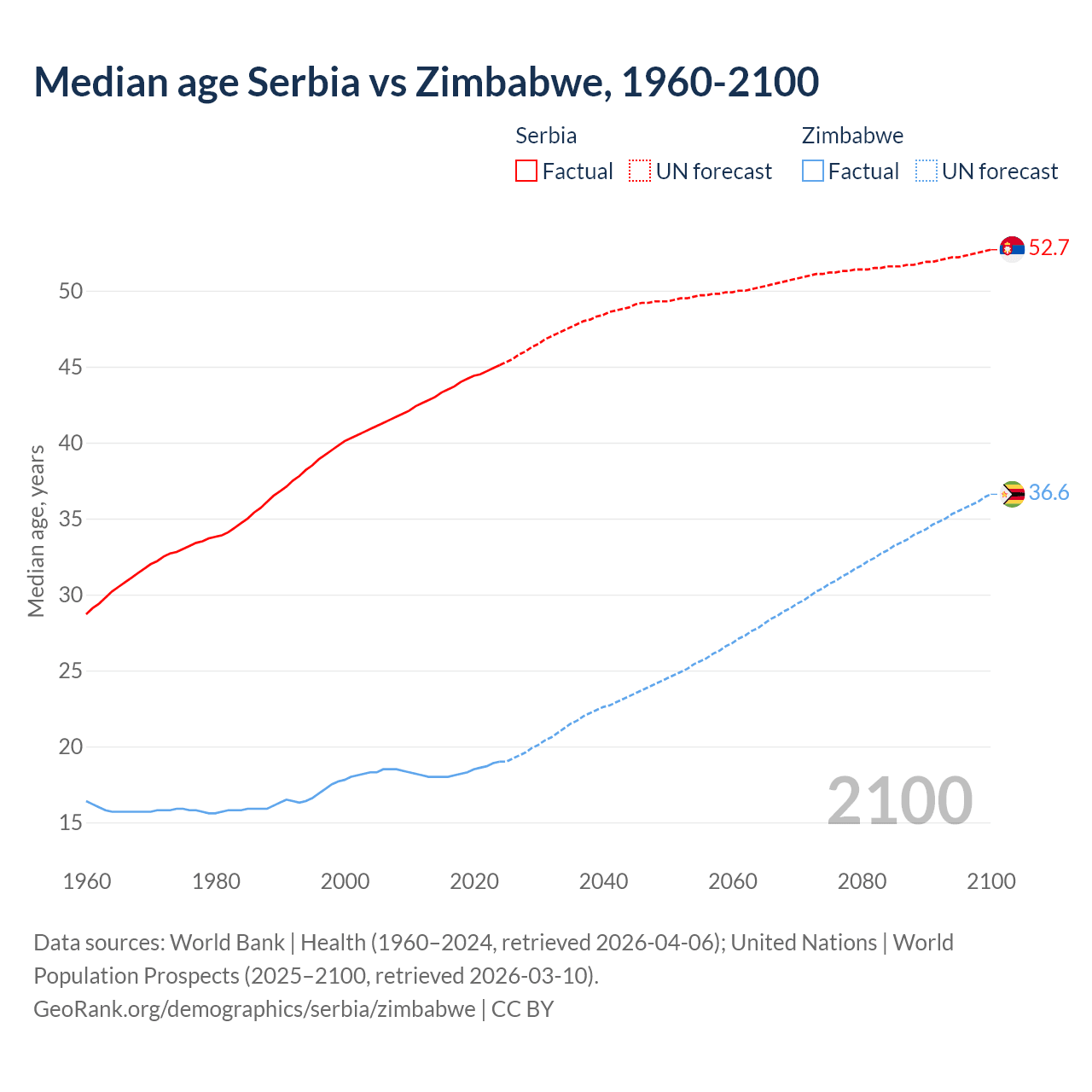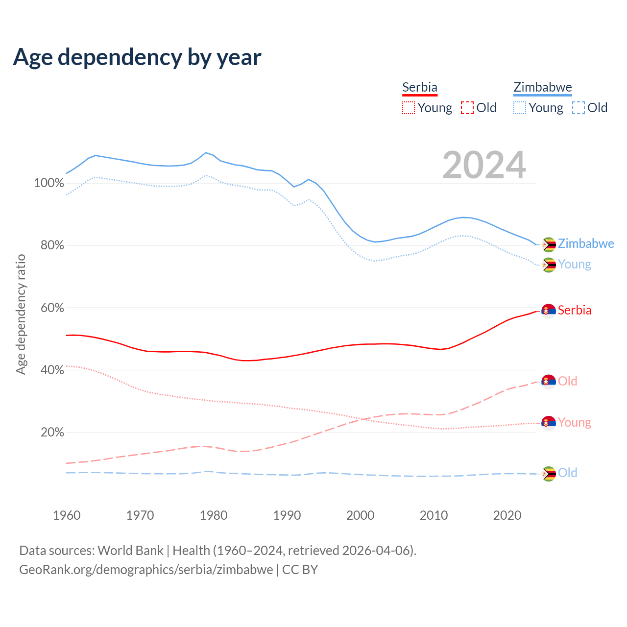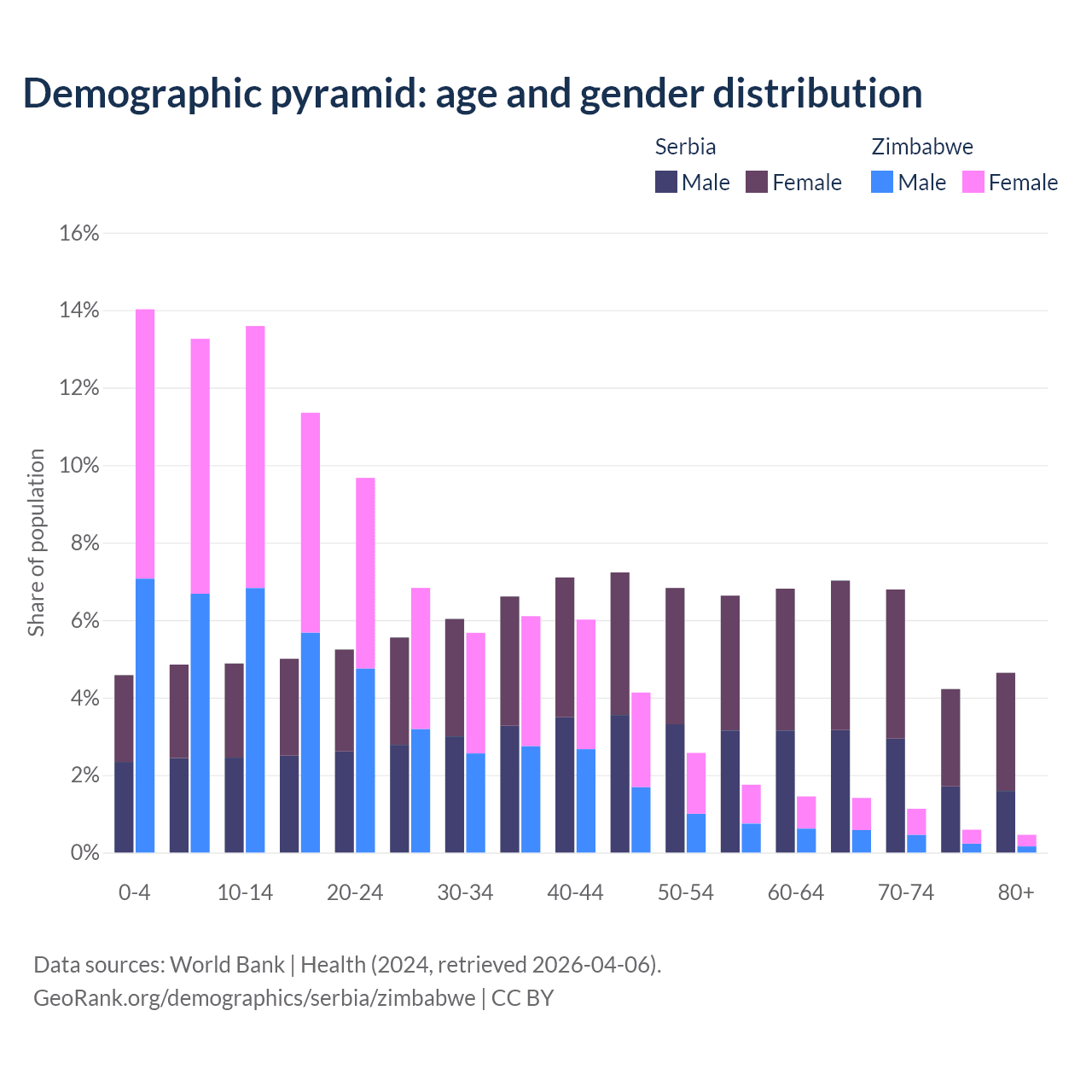 The share of older people aged 65 and over is 22.7% in Serbia and 3.6% in Zimbabwe. Life expectancy in Serbia compared to Zimbabwe .