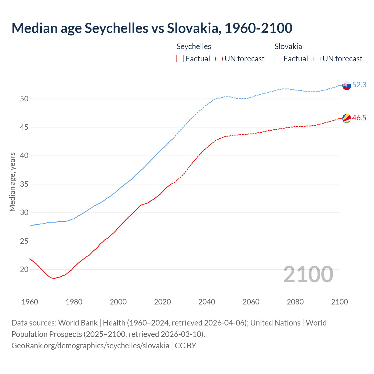 Median age Seychelles vs Slovakia, 1960-2100