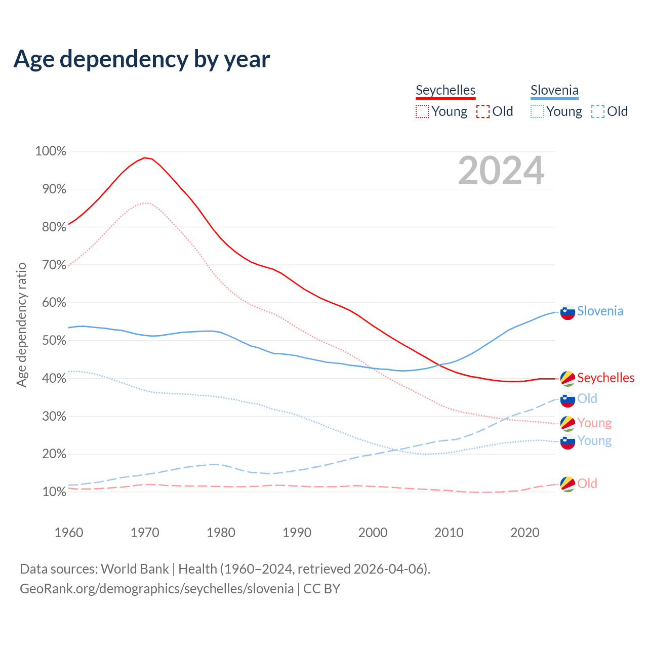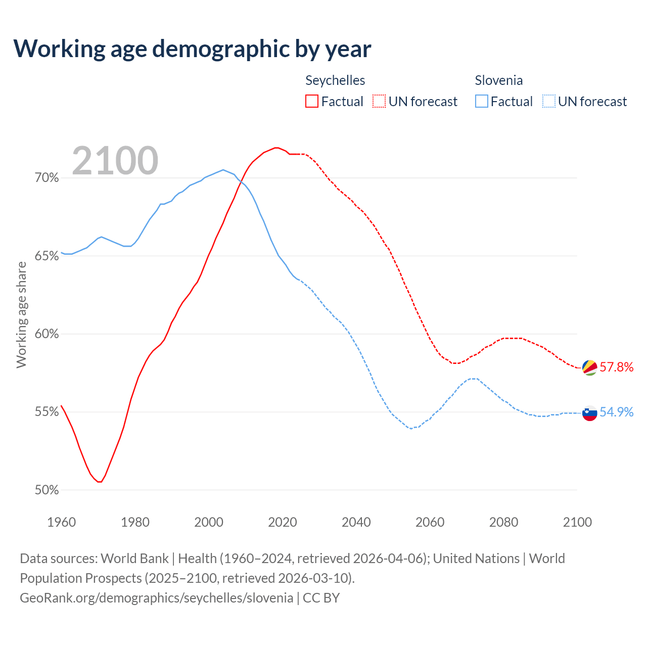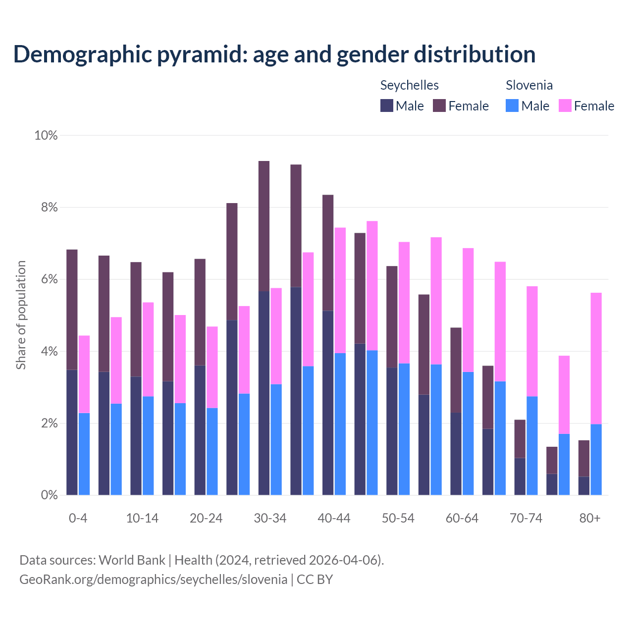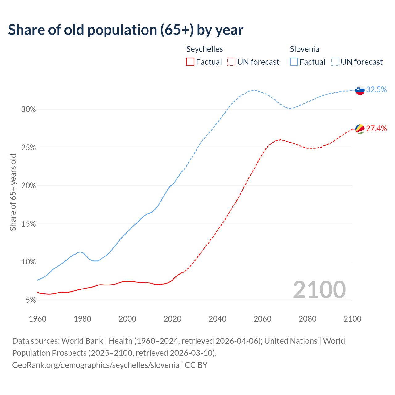 - The share of old-age demographic (65+) in the Seychelles is 8.54% vs 21.8% in Slovenia.
