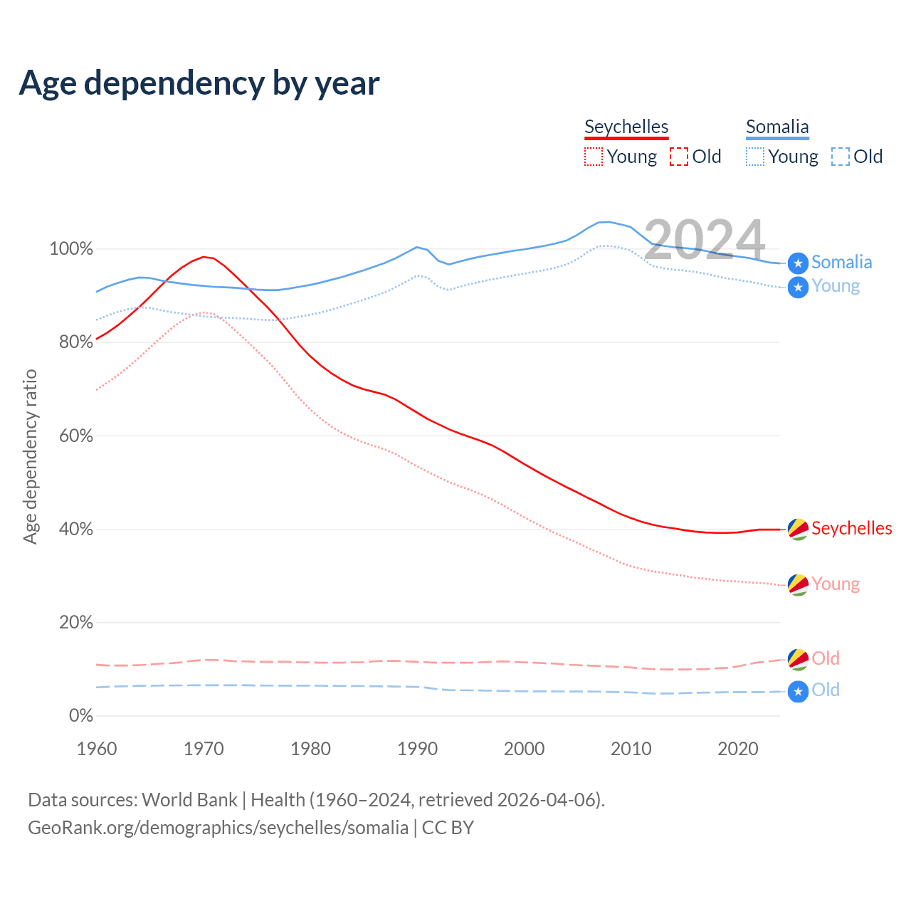 - The share of old-age demographic (65+) in the Seychelles is 8.54% vs 2.59% in Somalia.