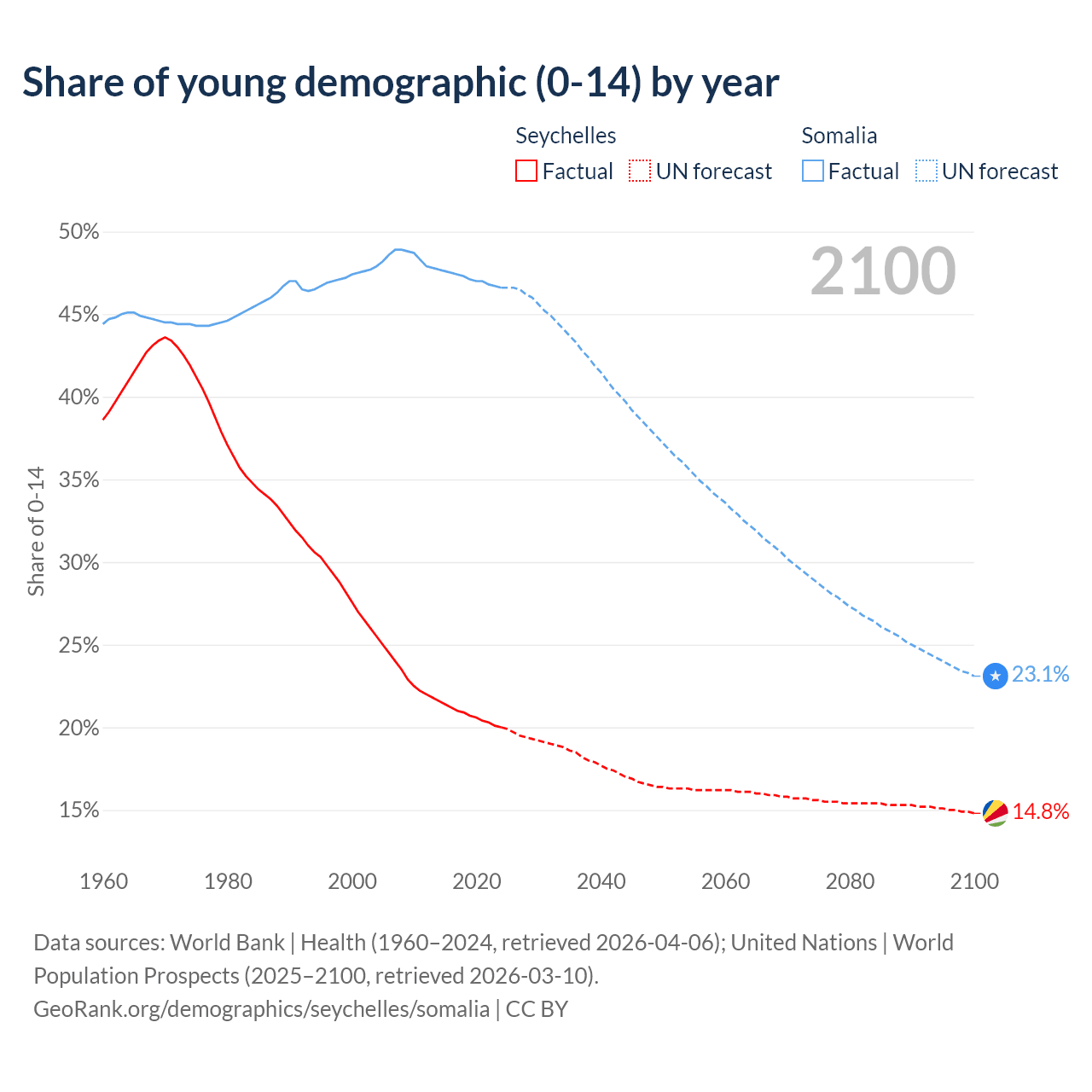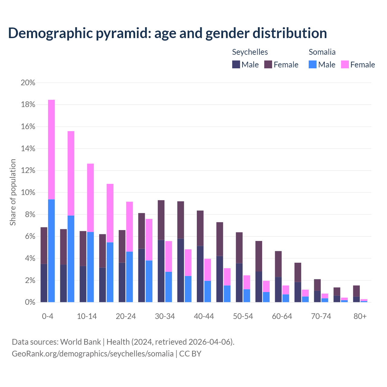 - The share of young demographic (0-15 years old) in the Seychelles is 20% vs 46.6% in Somalia.