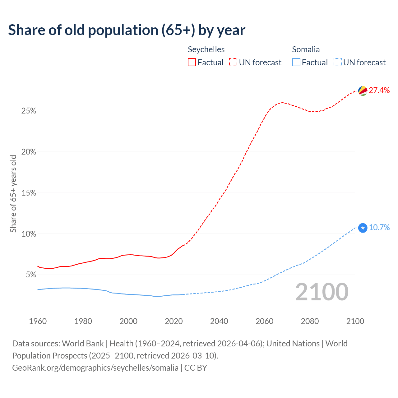 The share of older people aged 65 and over is 8.54% in the Seychelles and 2.59% in Somalia. Life expectancy in the Seychelles compared to Somalia .