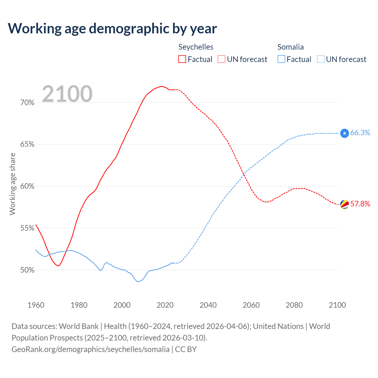 - The Seychelles has 90.3K working age adults (aged 15-64) vs 10.4M in Somalia.
