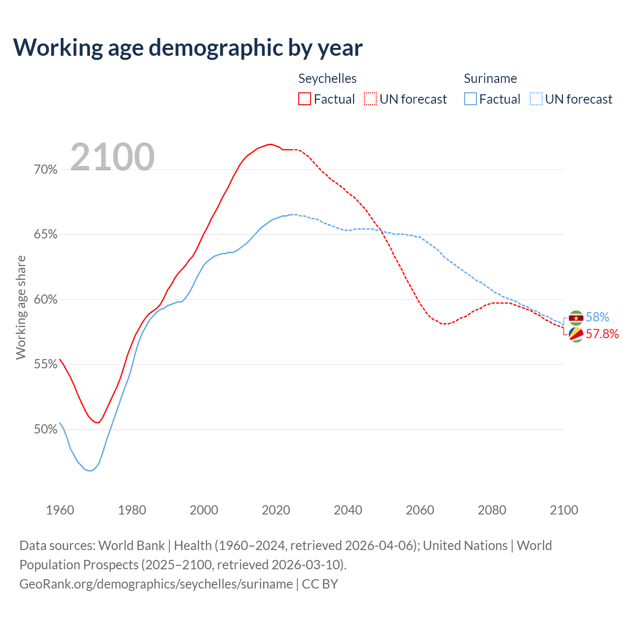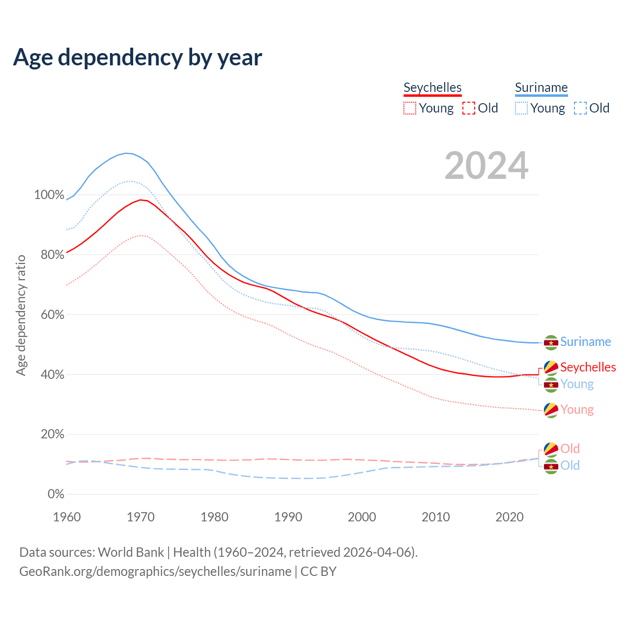 - The share of young demographic (0-15 years old) in the Seychelles is 20% vs 25.6% in Suriname.