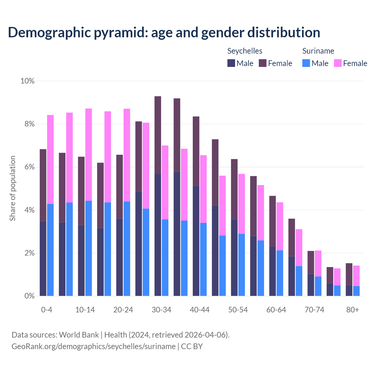 - The Seychelles is ranked 76/196 by median age (oldest to youngest) vs 109/196 for Suriname.