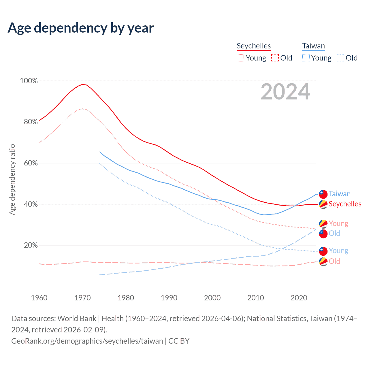 Data sources: World Bank | Health (1960–2024, retrieved 2026-04-06); U.S. Census Bureau (1960–2024, retrieved 2026-02-08); National Statistics, Taiwan (1974–2024, retrieved 2026-02-09).