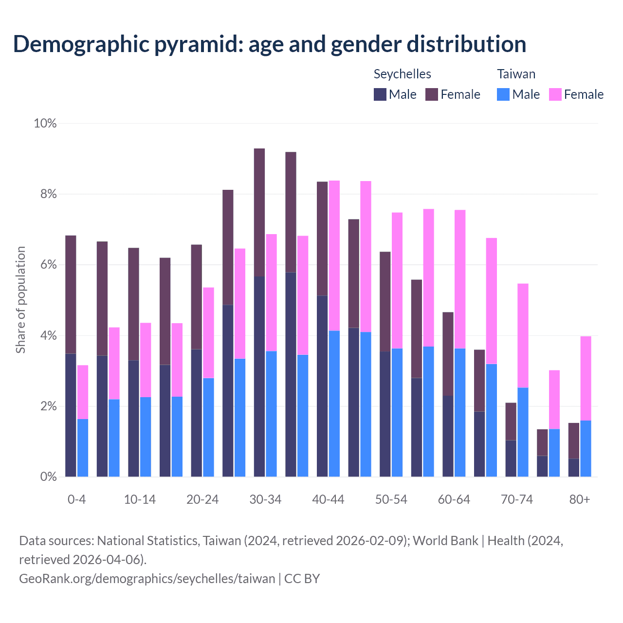 - The Seychelles is ranked 76/196 by median age (oldest to youngest) vs 16/196 for Taiwan.