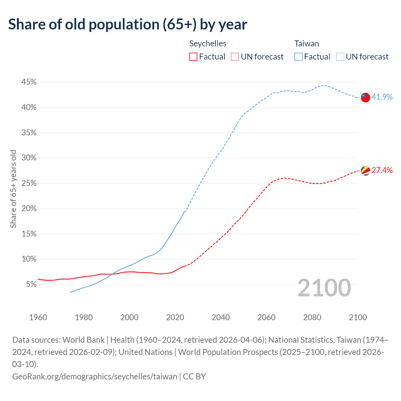 The share of older people aged 65 and over is 8.54% in the Seychelles and 19.2% in Taiwan. Life expectancy in the Seychelles compared to Taiwan .