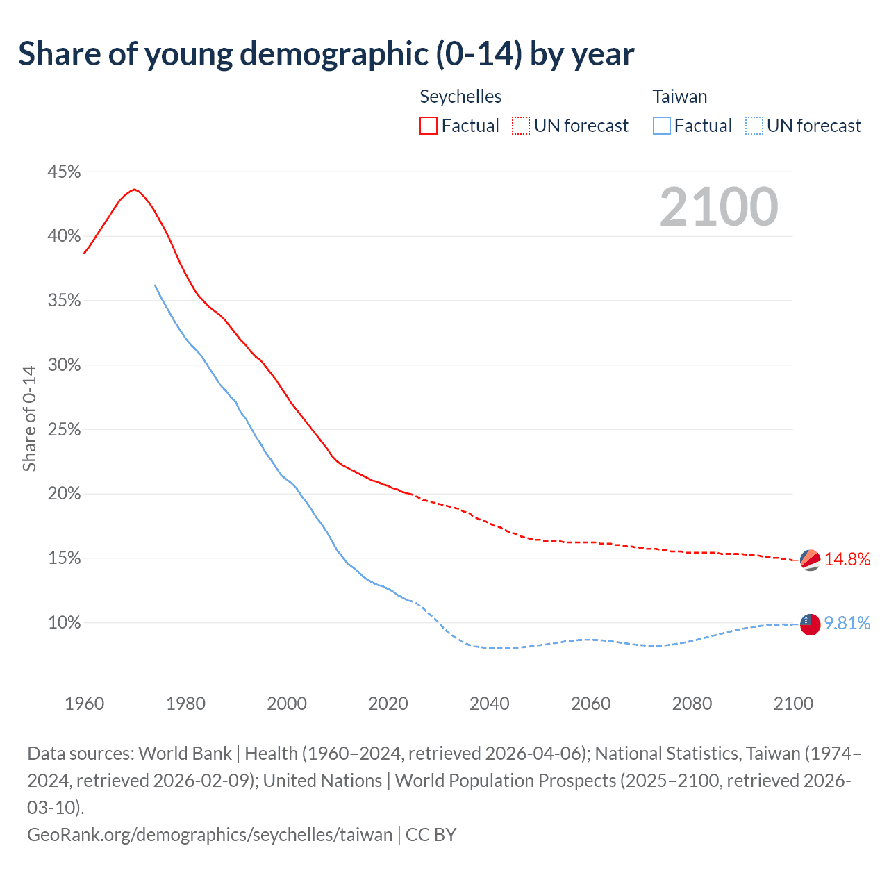 - The share of young demographic (0-15 years old) in the Seychelles is 20% vs 11.7% in Taiwan.