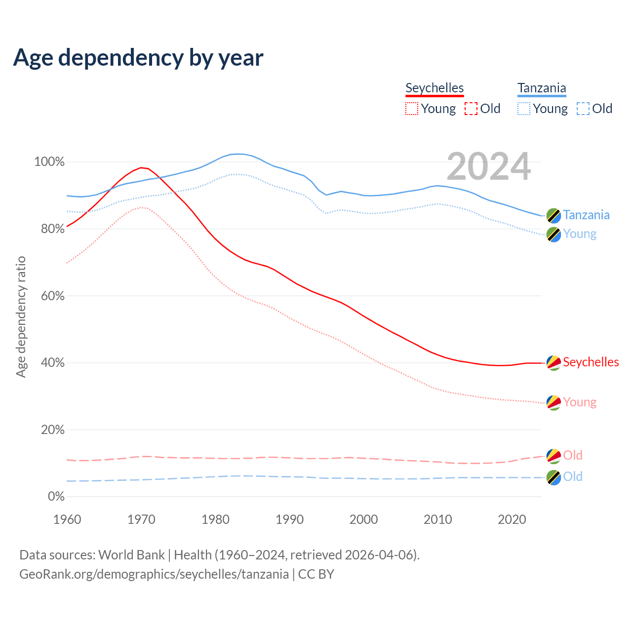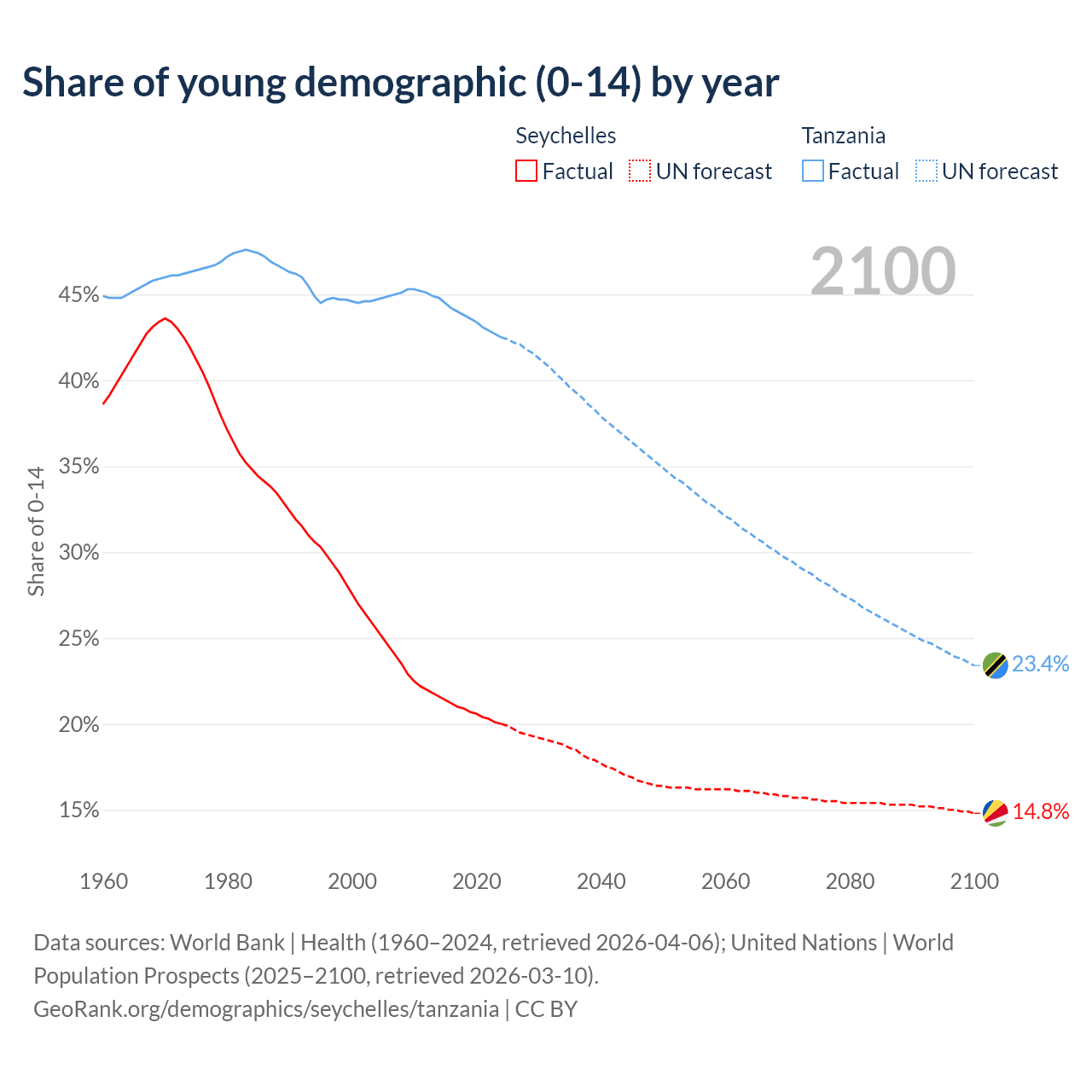 - The share of young demographic (0-15 years old) in the Seychelles is 20% vs 42.5% in Tanzania.