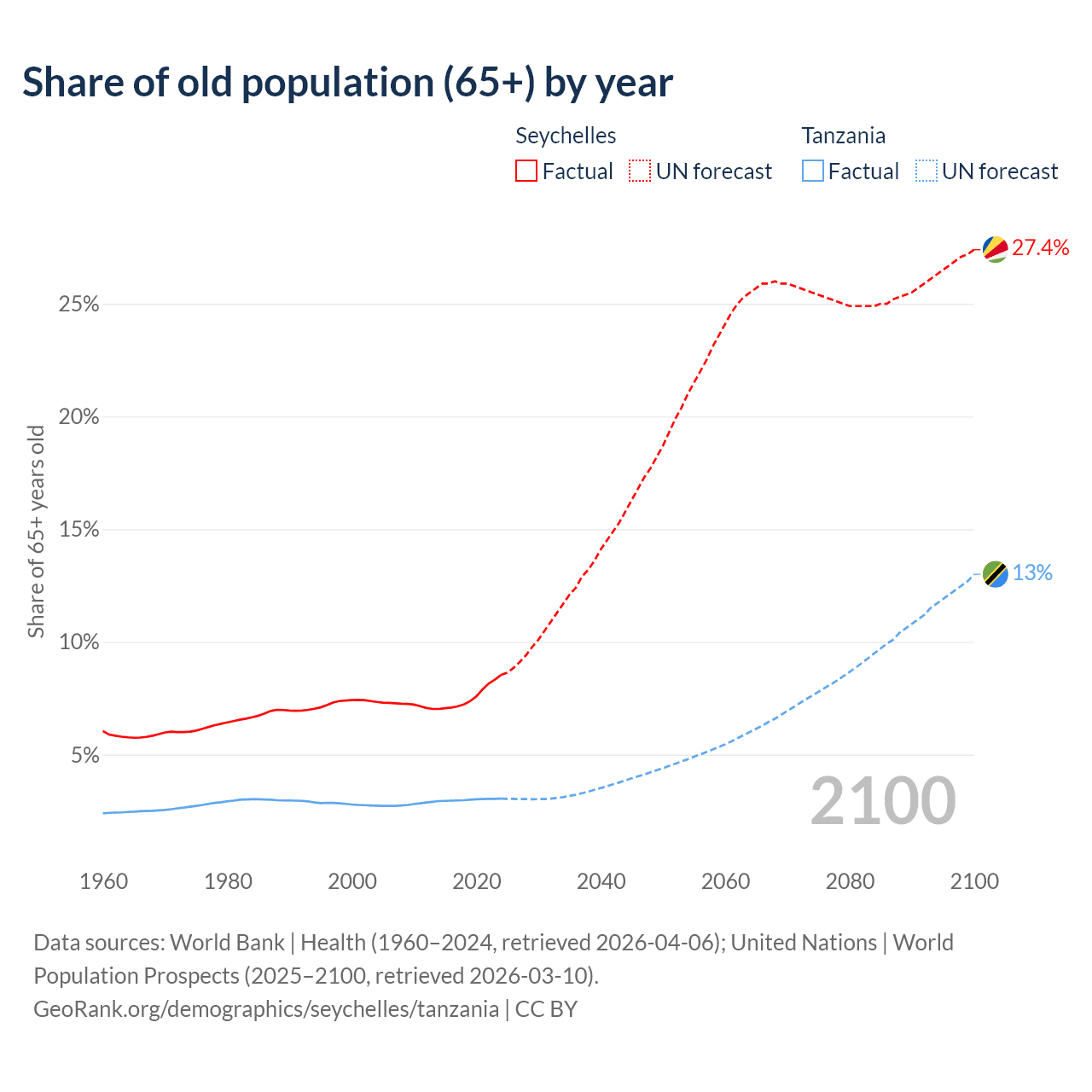 The share of older people aged 65 and over is 8.54% in the Seychelles and 3.05% in Tanzania. Life expectancy in the Seychelles compared to Tanzania .