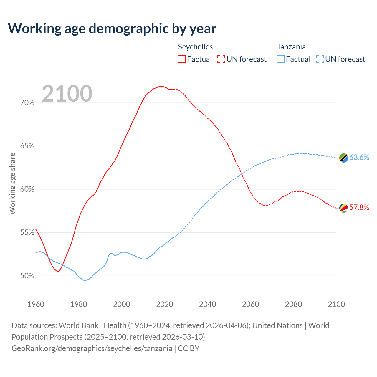 - The Seychelles has 90.3K working age adults (aged 15-64) vs 39.8M in Tanzania.