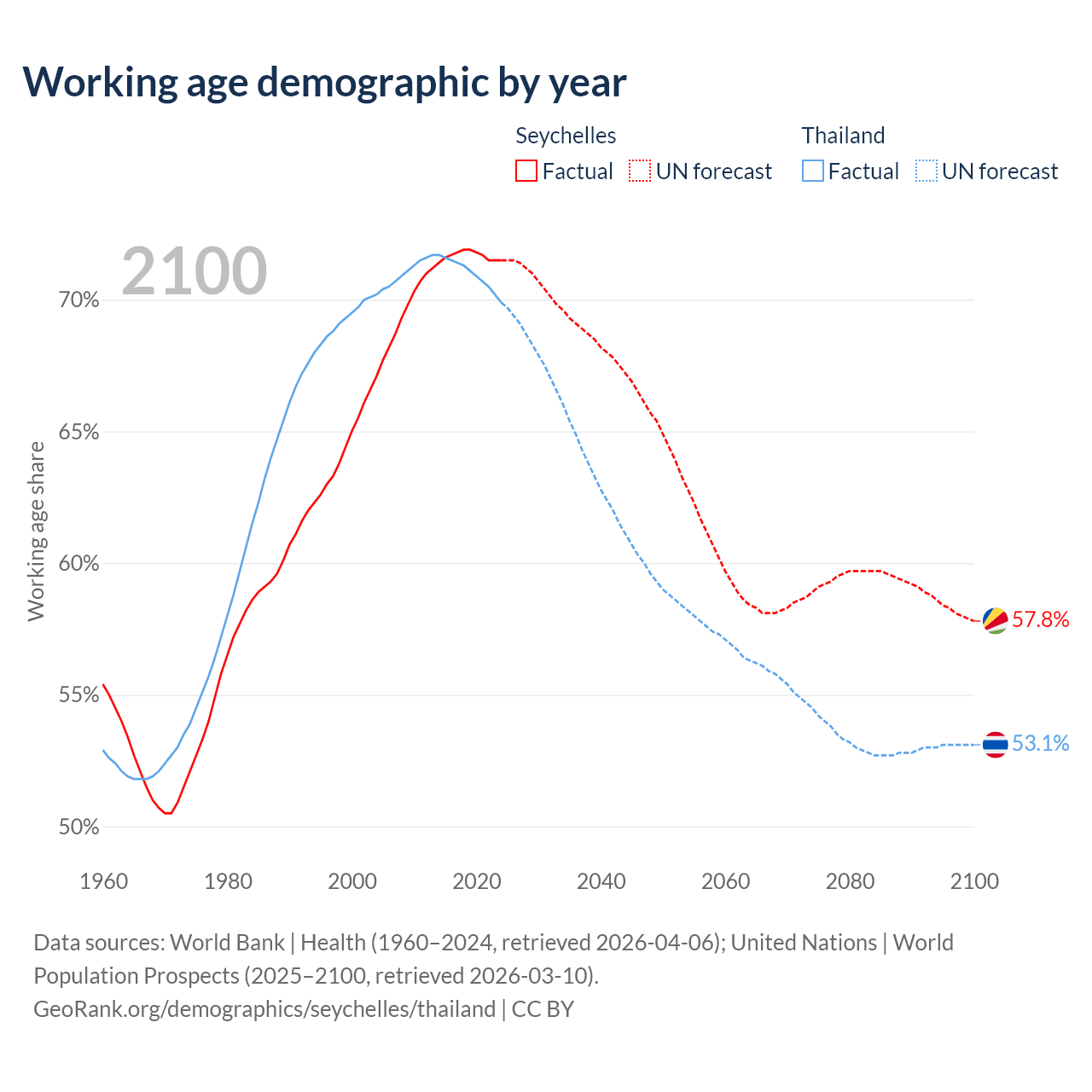 - The Seychelles has 90.3K working age adults (aged 15-64) vs 50M in Thailand.