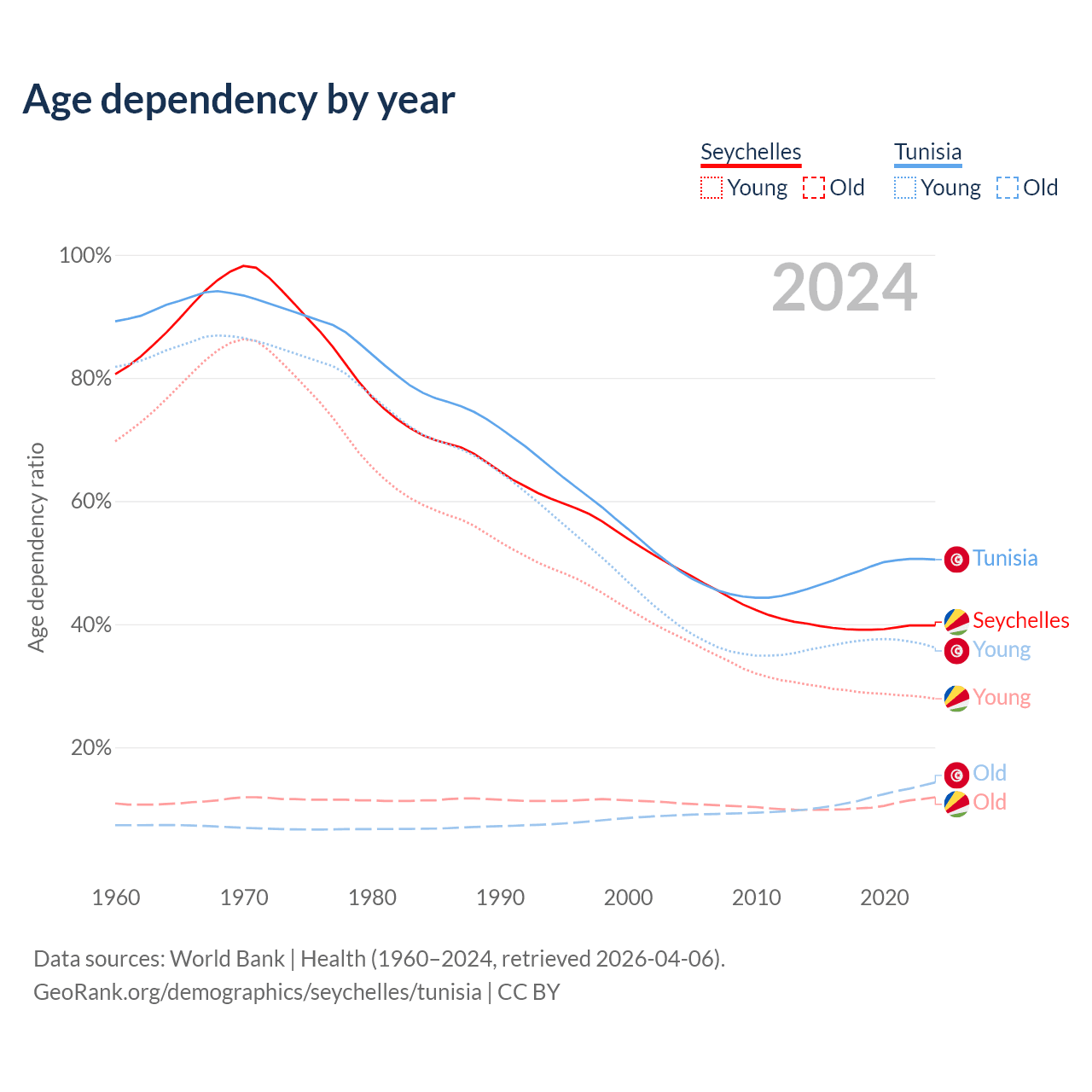 - The share of young demographic (0-15 years old) in the Seychelles is 20% vs 24% in Tunisia.