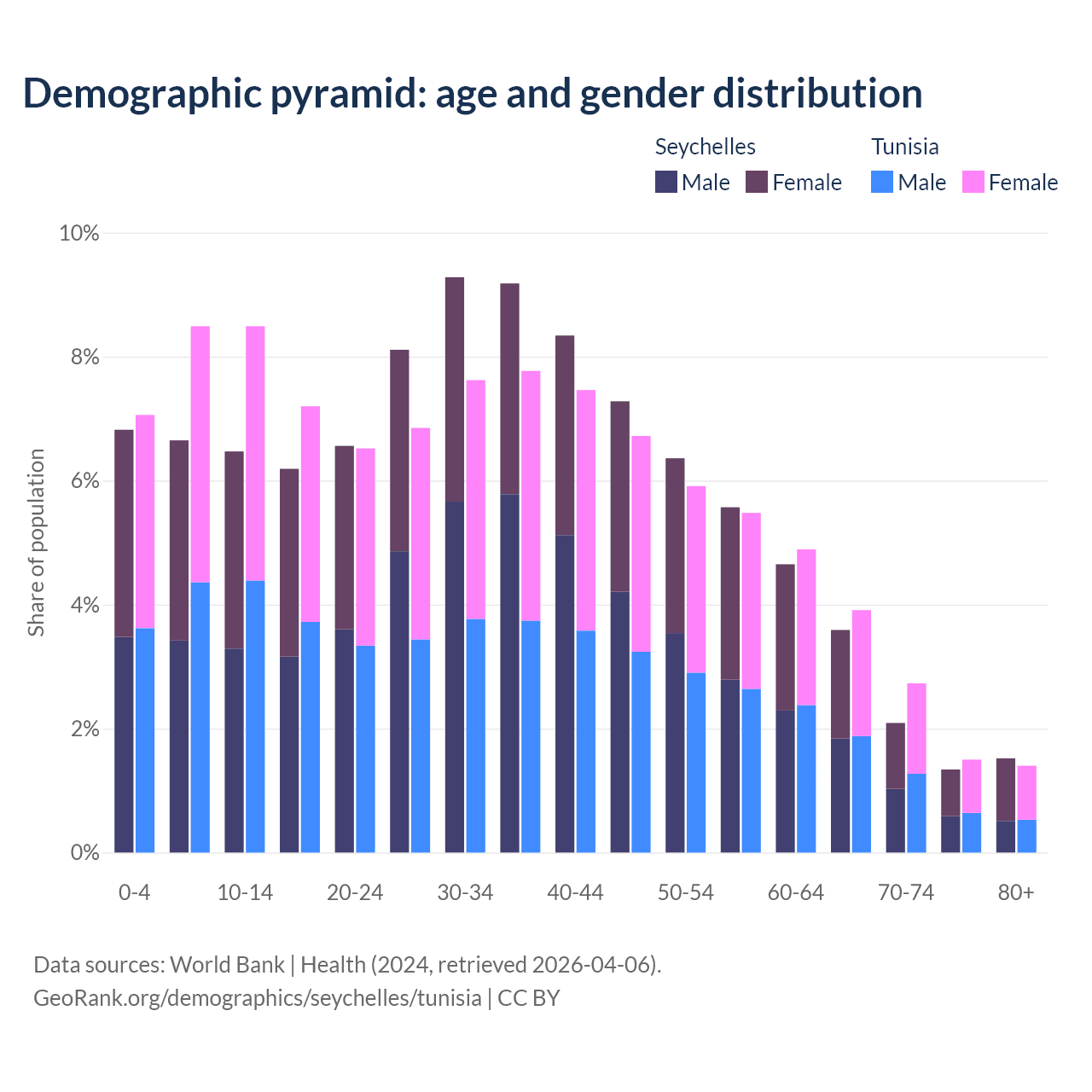 - The Seychelles is ranked 76/196 by median age (oldest to youngest) vs 86/196 for Tunisia.